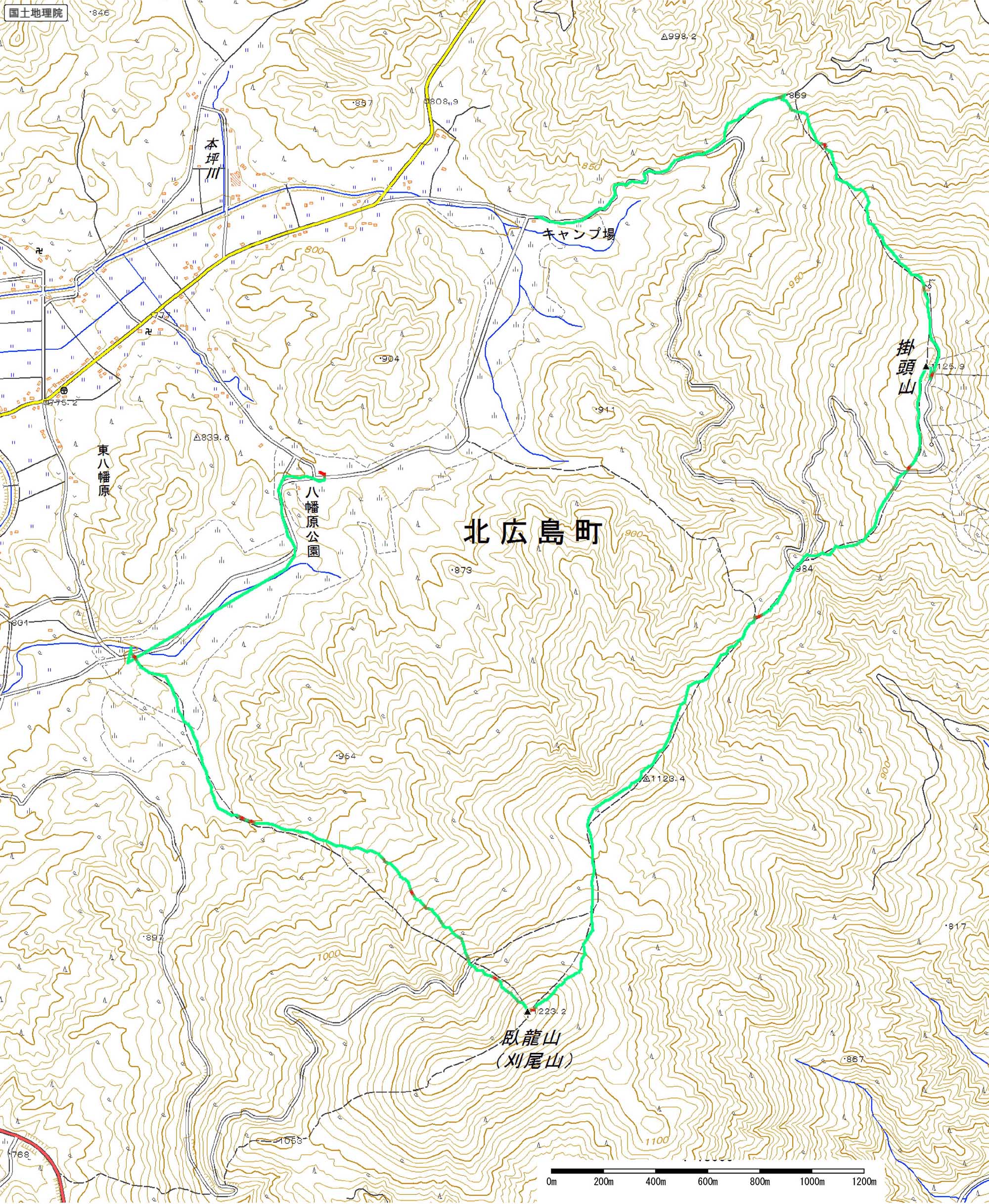 14:00掛頭山=15:00下山口=15:20キャンプ場―15:25かりお茶屋