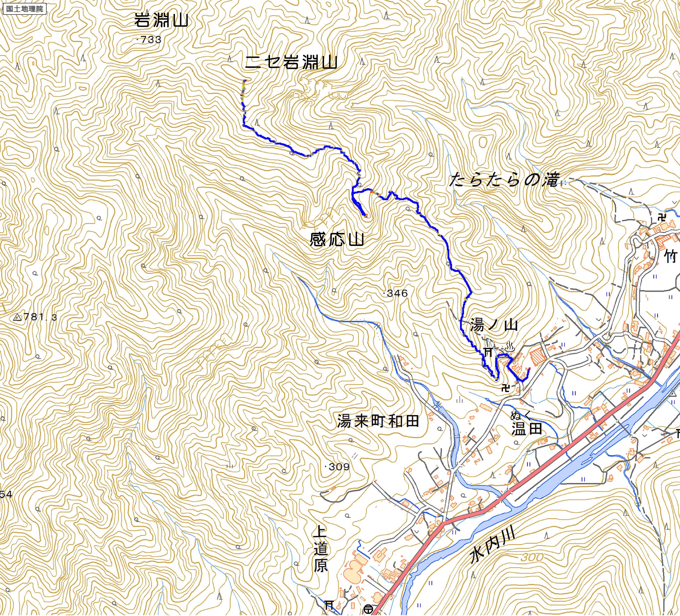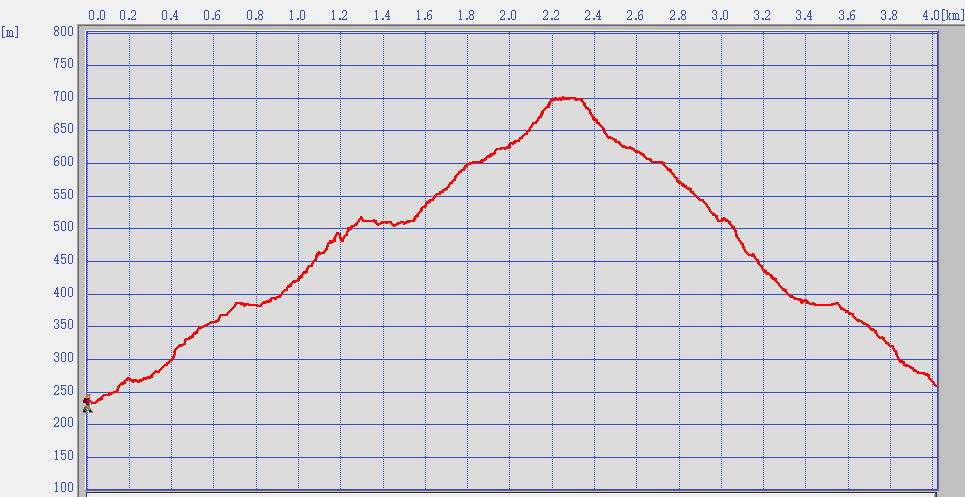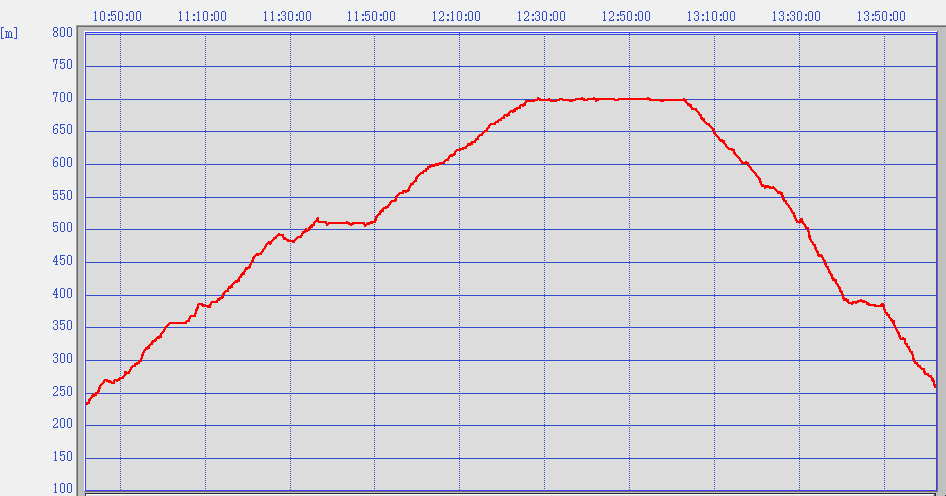 歩いたコース(上りのみ表示):青色(赤色は停滞場所)