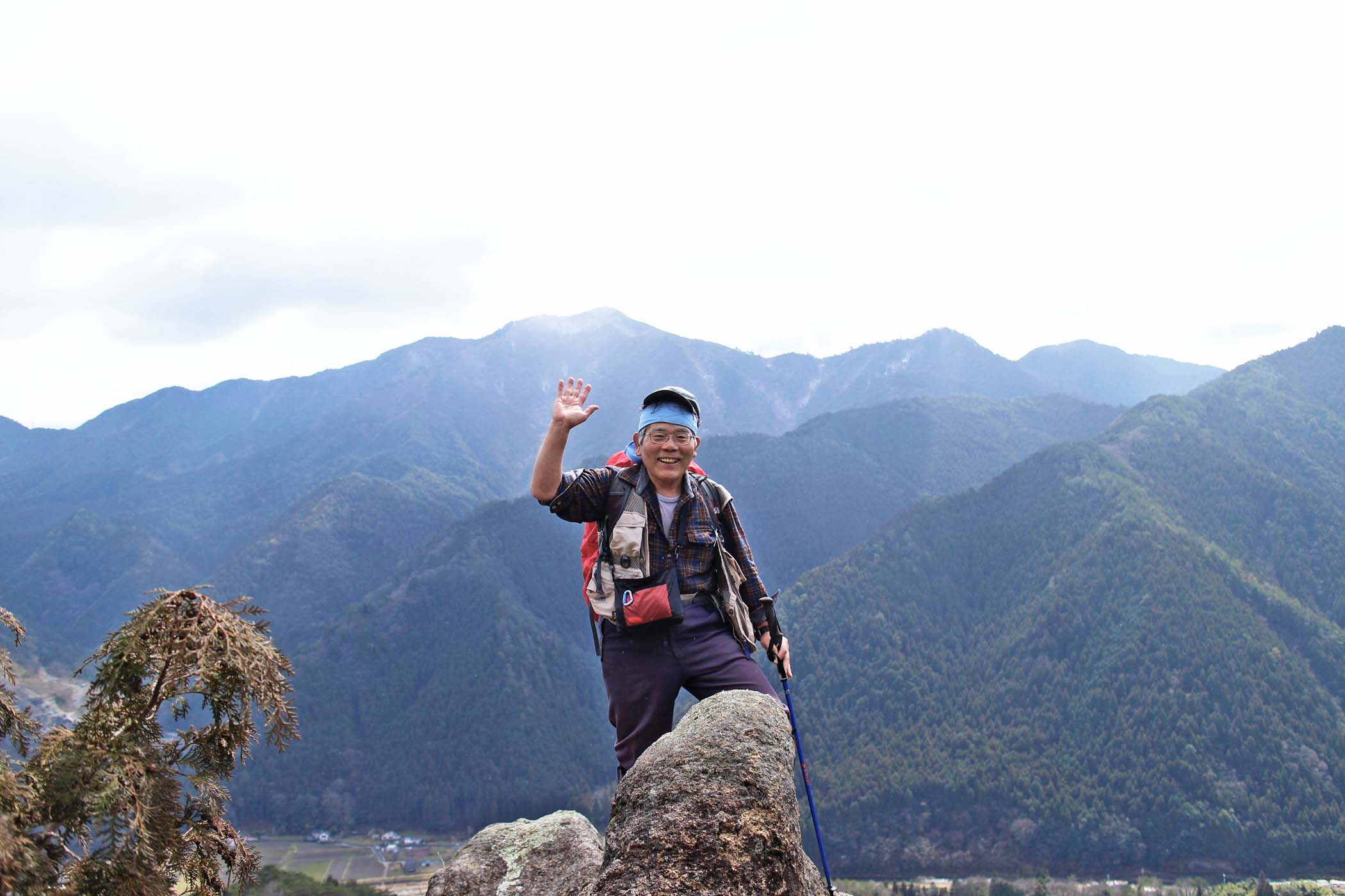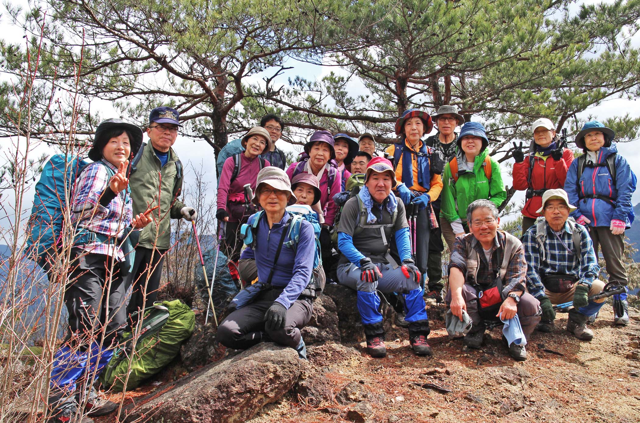 当日は雨の翌日、しかも明け方雪が降り足元の心配もありスパッツを付けて出発した。感応山では景色も良く、覗き岩では記念撮影されていたが、見てるだけでも足がすくむ光景でした。元会員の明石さんが先に岩淵山手前まで行かれたが、雪で足元が悪く感応山まで引き返されて、やまぼうしにわざわざ会いに来られ再会を喜びました。そこからはニセ岩淵山までは腰までの笹が茂り急登を何とか登りやっと昼食。下りは滑ったり、しりもちつきながら下山。帰りのバスの時間を気にしながらあわただしく入浴しました。