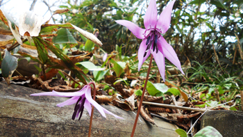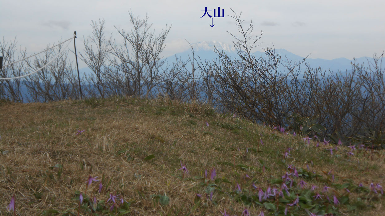ここから少し西に進むと登山道脇にカタクリが花をつけているのを見ることができ、追っていくと頂上到着しました。