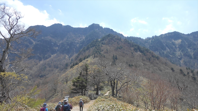 体力の残っている人は、リュックを下ろして天狗岳へ。岩に書かれたルートの矢印を確認しながら慎重に岩場を進み、無事、天狗岳山頂へたどり着く。記念写真を撮り、帰り道は、行く時よりも怖かった。予想以上に時間がかかり迂回路組をだいぶ待たせる事になり土小屋への出発が遅くなってしまった。弥山神社前で記念写真を撮り、修行者の吹くホラ貝の音を背中に聞きながら、土小屋目指して出発。所々に雪渓が残っている。やはり標高が高いからそれだけ寒いのだ。道沿いにアケボノツツジが所々に咲き乱れ、その美しさにみんなで声を上げたり、写真に撮ったりしながら国民宿舎に到着。入浴した後、夕食開始。ビールで乾杯して先輩の方々の話や、以前登った山の話をいろいろ聞けて楽しい時間となった。