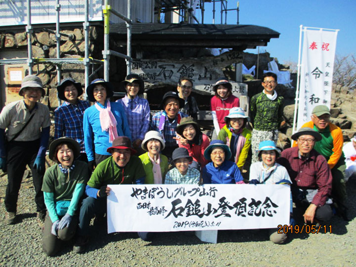 ここで昼休憩。石鎚山をバックに記念撮影をした後、下山開始。少し長いヤブを下り、分岐からは来た道を下る。時間の関係で、岩黒山は取りやめになった。土小屋登山口に着くと、みんな急いで白石ロッジの売店でお土産を購入。着替えたり、トイレを済ませて、一路広島へ。途中、運転手さんが石鎚山の絶景スポットでバスを停めてくれて、みんな車窓からカメラで撮っていた。