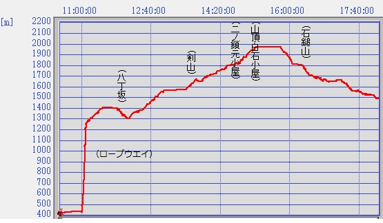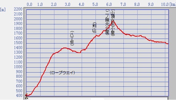 広島駅新幹線口6:55出発⇒ロープウェイ下バス着10:30〜ロープウェイ 11:00-11:10成就駅着〜成就社11:30-11:50〜八丁12:10〜前社ヶ森(昼食)13:00-13:30〜夜明峠13:50〜二の鎖元小屋14:30-14:40〜弥山(天狗岳へ半数)15:10-15:50〜二の鎖元小屋16:10-16:20〜国民宿舎18:05着