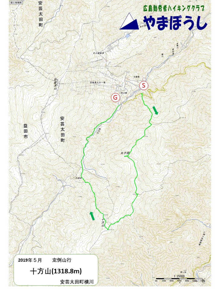 県庁北7:30⇒広島駅北口⇒中筋⇒広島IC⇒戸河内IC⇒二軒小屋9:4⇒藤本新道登山口9:50〜丸子頭11:20〜11:50那須別れ(昼食)12:30〜13:00十方山13:15〜獅子ケ谷登山口14:20〜15:00二軒小屋⇒戸河内IC⇒広島IC⇒17:30県庁(歩行時間約 4時間30分)