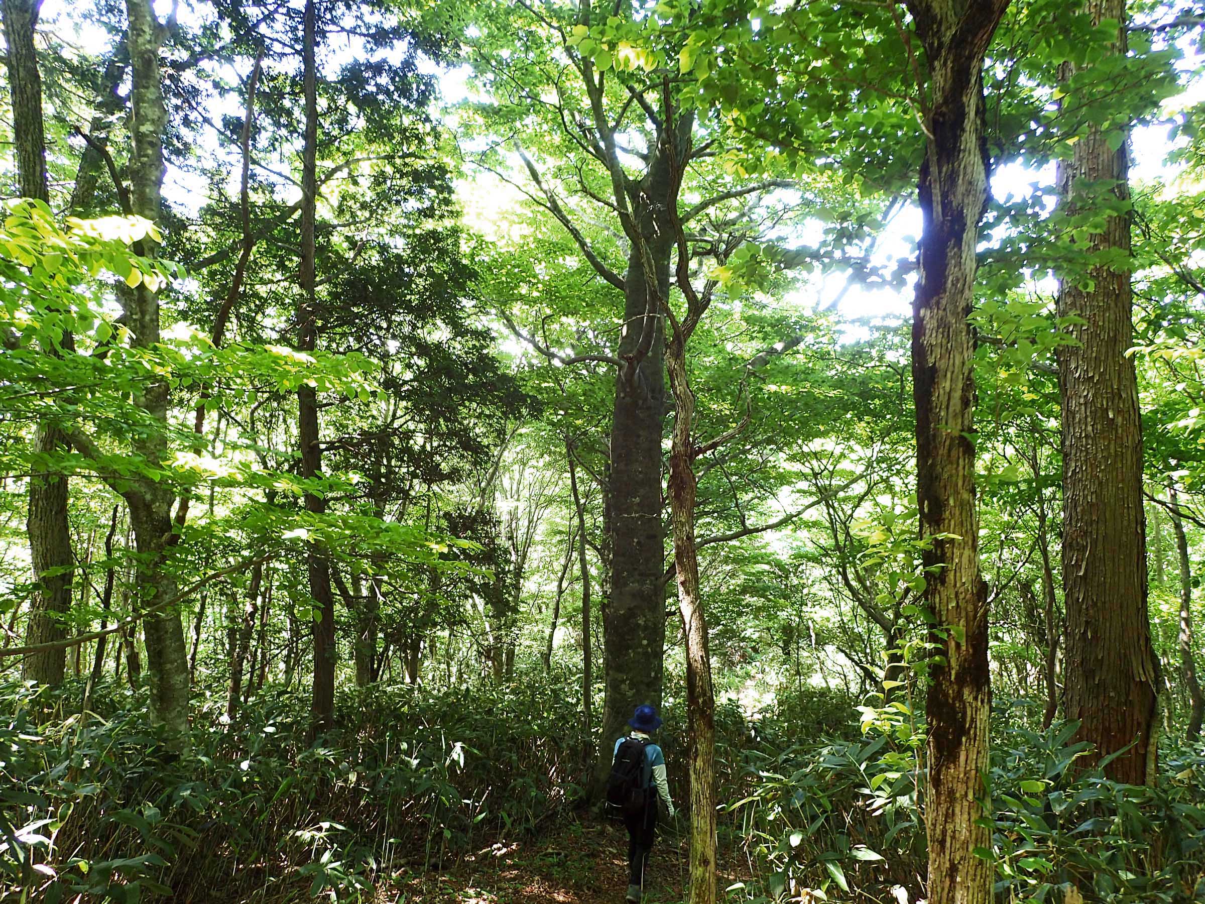 午後になると逆コースの登山者とすれ違う。ブナやトチの倒れた巨木を跨ぎ、小さな沢を超え、三段程の梯子を登り、変化に富んだ山道を更に行く。さすがに千Mを超えた山である。あれやこれやと想いながら歩くと山頂に到着する。ガイドブックの案内の如く大草原で、平面でさえぎるものが無く十方が見渡せる。「ところで日本海はどの方向に?」