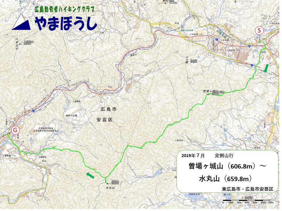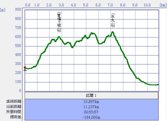 八本松駅8:30⇒登山口8:50→供養塔→二の丸跡9:30〜三の丸跡〜曾場ヶ城山10:00着〜10:20分出発→11:00小倉山着→12:00弥山着(昼食)12:40〜出発13:35着水ヶ丸山13:50出発→15:00奥の原下山口→15時15バス停