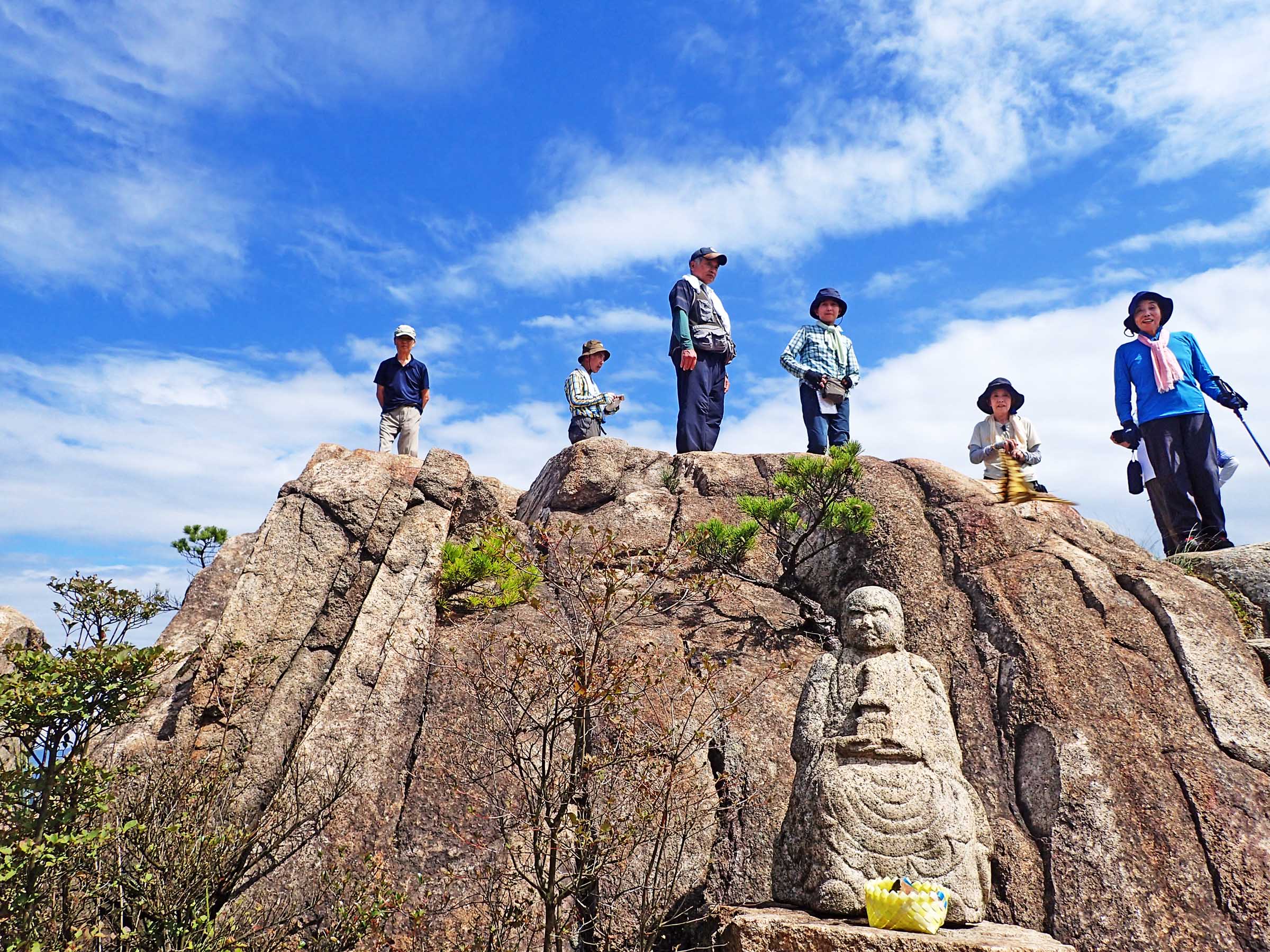 昼食で少し元気も回復し早めに龍泉寺へ。龍泉寺にザックを置き、本堂左手より白滝山山頂へと登る。山頂にある八畳岩に上がると360度の素晴らしい景色が広がり、一瞬暑さも忘れて感激する。下山組SL曽田さんよりさくら堂着との連絡があり、こちらも下山開始。 再び暑さを水分補給でしのぎながら何とかさくら堂着、下山組の皆さんと合流でき一安心した。