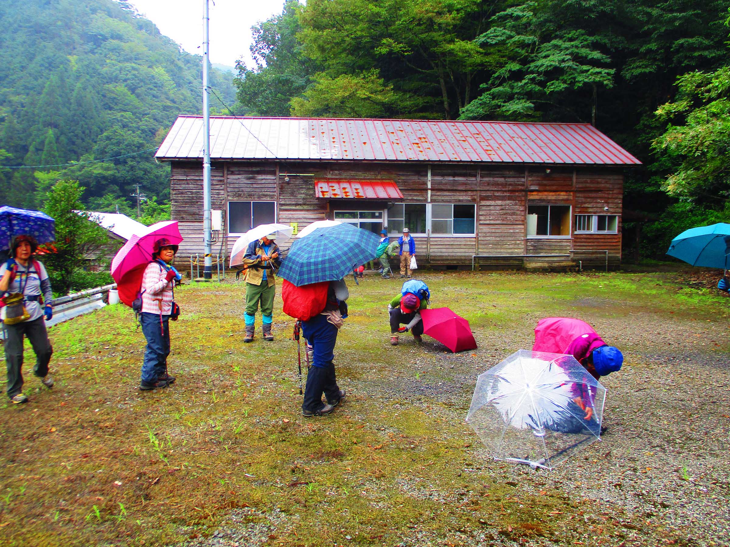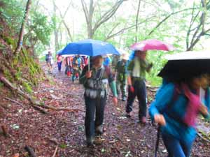弱い雨の中、傘をさして日浦公民館を出発しました。少し進むと舗装道から石の多い林道となり公民館から約1時間30分でやっと登山口に到着しました。登山口から山中に入ると、雨は気にならなくなり傘を閉じて歩きました。三子山とは「南峰」「中央峰」「北峰」の三つの峰が等間隔に並んで、山名の由来となったそうです。住民により整備された登山道は歩き易く快適でありました。急登ケ所に苦戦した所もありましたが、30分弱の比較的短時間で「南峰」に到着しました。頂きの眺望はあまりよくはありませんでしたが平場があり、そこで昼食をとることになりました。昼食中も雨は気にならない程度に降り続いていました。昼食を終えると、14分で三角点のある「中央峰」に到着しました。時間的にみると13:30でこれから雨中の下山と、林道の歩行時間を勘案して「北峰」を断念して下山することを宮木リーダーは決断されました。山の事故の大半は下山中であり、雨で滑り易くなっていることから、慎重に歩を進めました。幸い落ち葉が緩衝材となり滑り止め効果となりました。このこともあり、誰一人転倒する者もいなく無事下山して日浦公民館に戻りました。