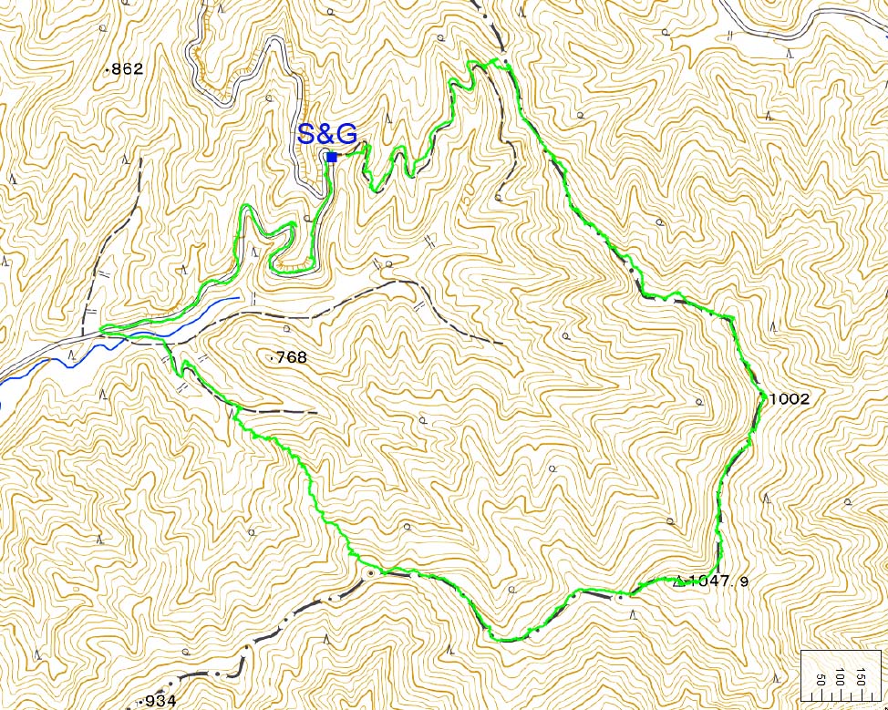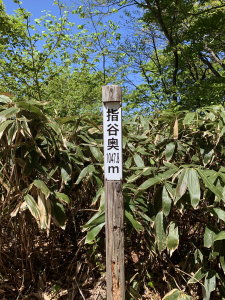 林道(明眼寺谷ルート入口)11:10→12:30ピーク(1002m)13:15→13:30指谷奥13:45→14:10杉ヶ谷コース分岐→14:50林道(杉ヶ谷コース入口)→15:20出発地点