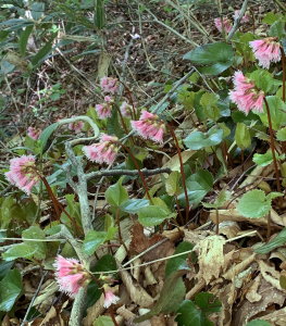 ブナの新緑とイワカガミの花の中心は指谷奥である。その西の指谷山まで行くと出発点に戻るまで遠いので、定例山行の予定コース途中の杉ヶ谷コースを下山することとした。
