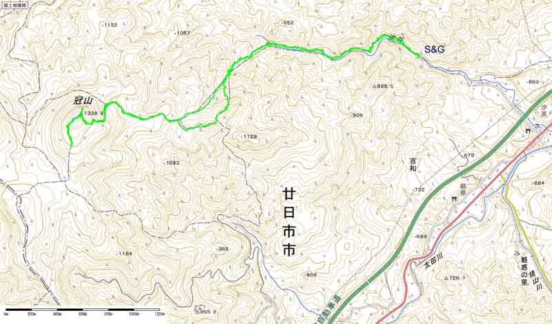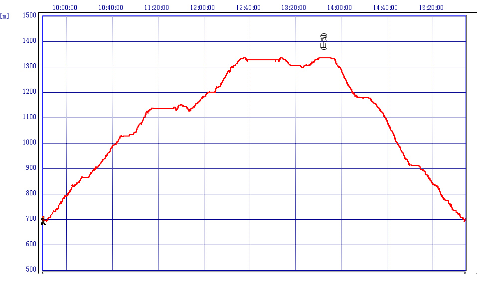 広島駅7:40⇒9:35汐谷登山口9:45→11:10クルソン岩11:30→12:35冠山山頂(昼食)13:05→13:15太田川源流方面13:30→13:40冠山山頂13:50→15:00林道15:10→15:45汐谷登山口16:00⇒17:40広島駅