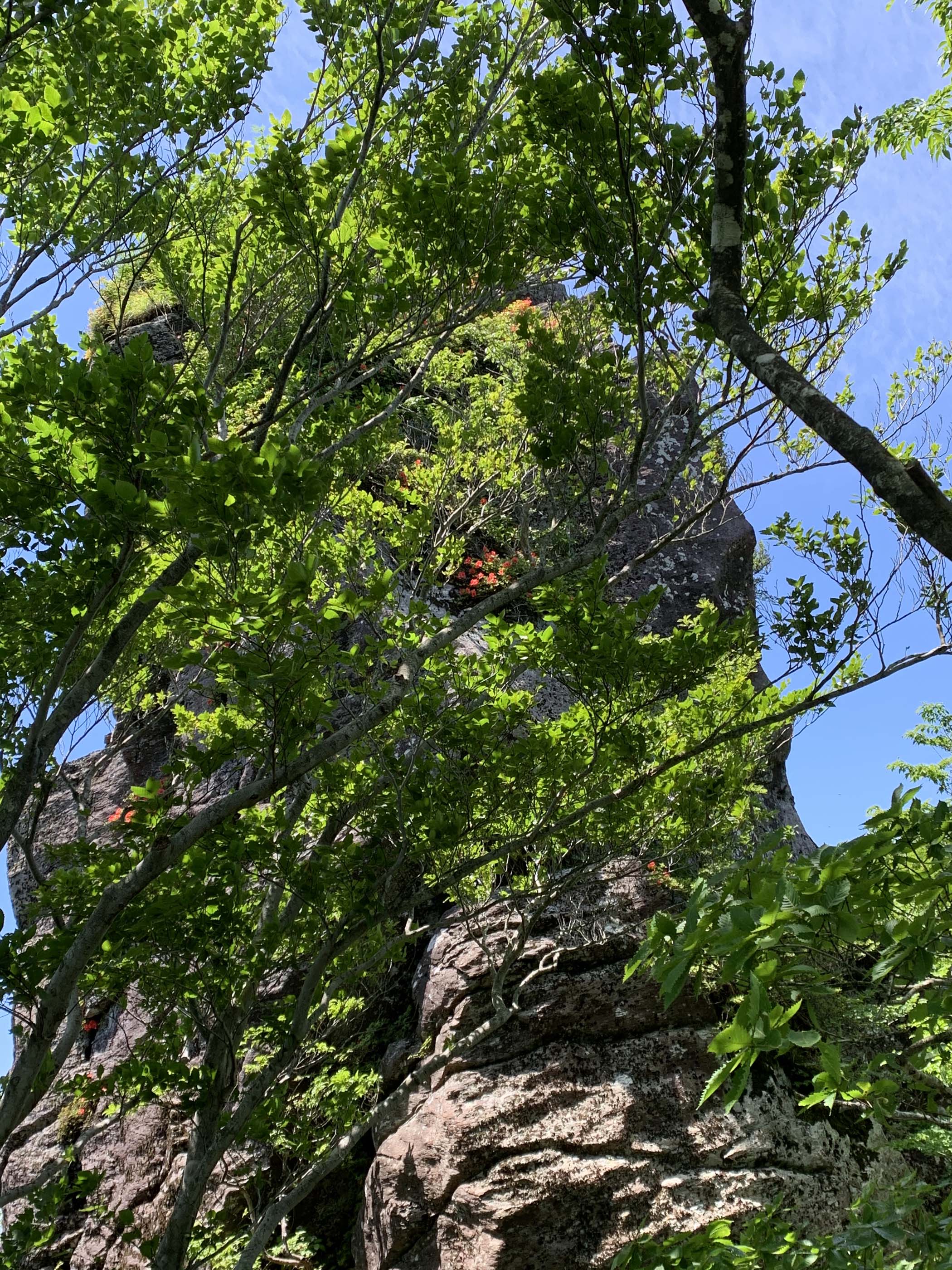 夏至に近く強い日差しであったがこのコースは緑の日傘が山頂まで続き、気持ちよく歩くことができた。 天気が良いのでクルソン岩に寄る。急登を登り切ると大きな岩、その上の方にツツジの花が咲いて迎えてくれた。 冠山の山頂では展望の良い岩場で昼食。風が最初は気持ちよかったが、寒くなってきた。おまけにブヨなどの虫が多い。 早々に切り上げて太田川源流方面へ下る。オオヤマレンゲは丁度時期、だが花をつけている木は1本だけでちょっと寂しかった。