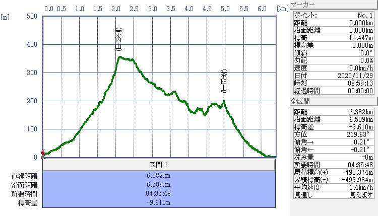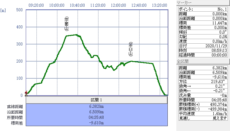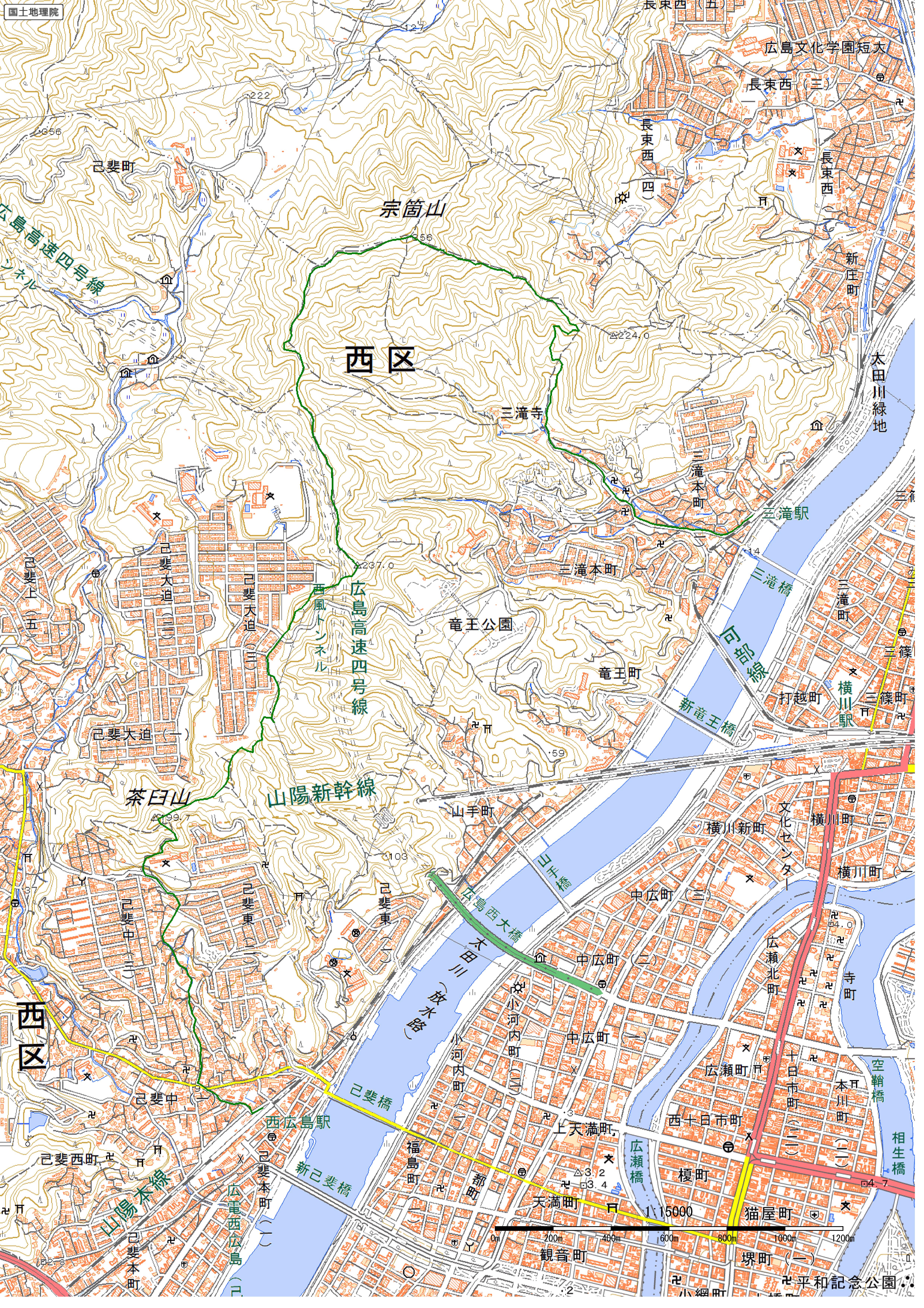 三滝駅9:00→三滝寺9:30〜9:50→宗箇山10:20着(休憩)10:35発→小茶臼山12:15着(昼食)13:00発→西広島駅北口13:30着 解散