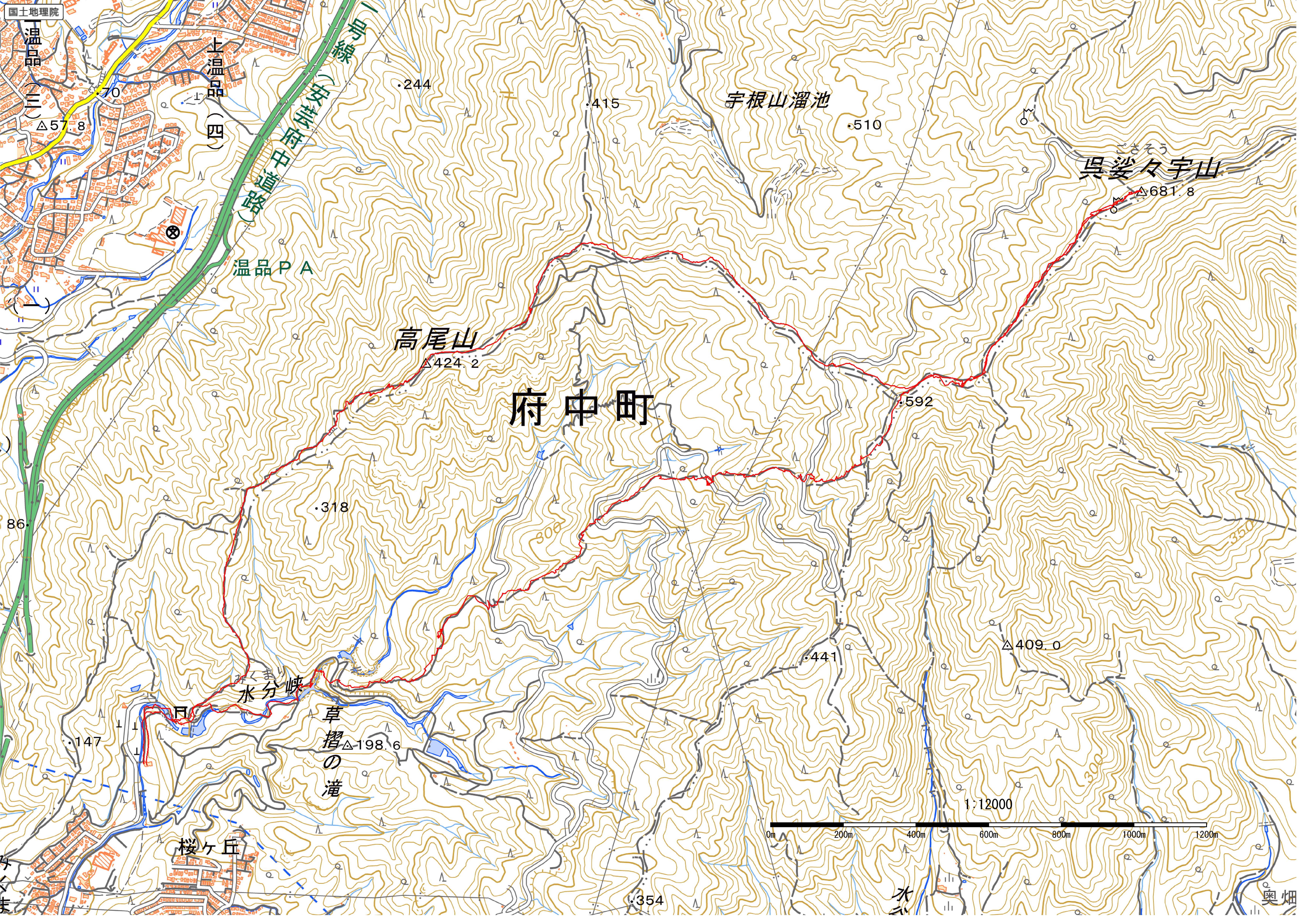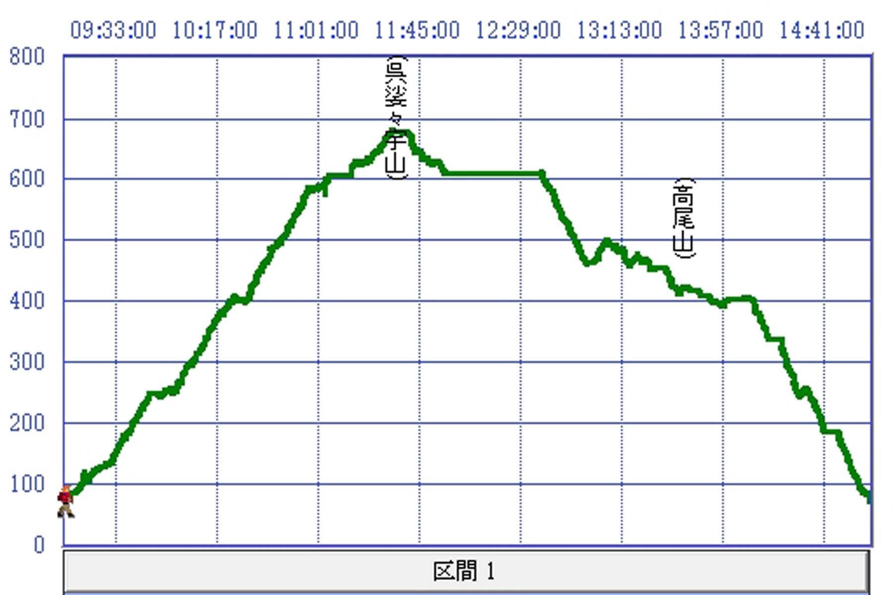 広電バス停4名 8時40分集合→みくまり駐車場15名 8時50分集合(バス参加者、自家用車参加者合流)→9時10分出発→みくまり神社→東屋(9時40分着、9時50分発)→草摺りの滝→バクチ岩(11時10分着、11時20分発)→呉婆々宇山山頂(11時40分着、11時45分発)→バクチ岩(12時00着 昼食、12時30分発)→高尾山山頂(13時40分着)→岩谷観音、岩谷観音跡(13時50分着、14時10分発)→みくまり駐車場15時着(解散)