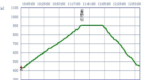 しばらくするとジグザグの登りとなりました。急坂でしかも前日の雨の影響で滑りやすく足元に気をつけ喘ぎながら登りましたが、1、2人は滑られたようでした。生徒の手による100mごとの標識版を「あと800b」で気づき、私は「600b」から「500b」、「400b」と、通過する毎にHさんと標識版の写真を撮りました。頂上近くの「あと300b」の標識版から頂上までは火口の中なのか平坦でほっとする歩きとなりました。山王権現の石祠をまわりこむと3等三角点の青の山山頂に到着。