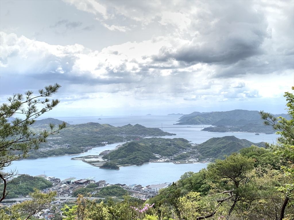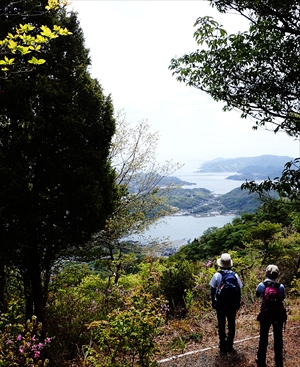 バスの終点の上福地で下車して、おのおのストレッチをして、出発。目の前に魅力的な鳴滝城山が見えます。が今回は見るだけにして進みます。徐々に急な登りになり、ずんずん急な登りを30分あまり上ると数軒の民家を越して車道に出たところで小休止。瀬戸内海がきれいに見えます。