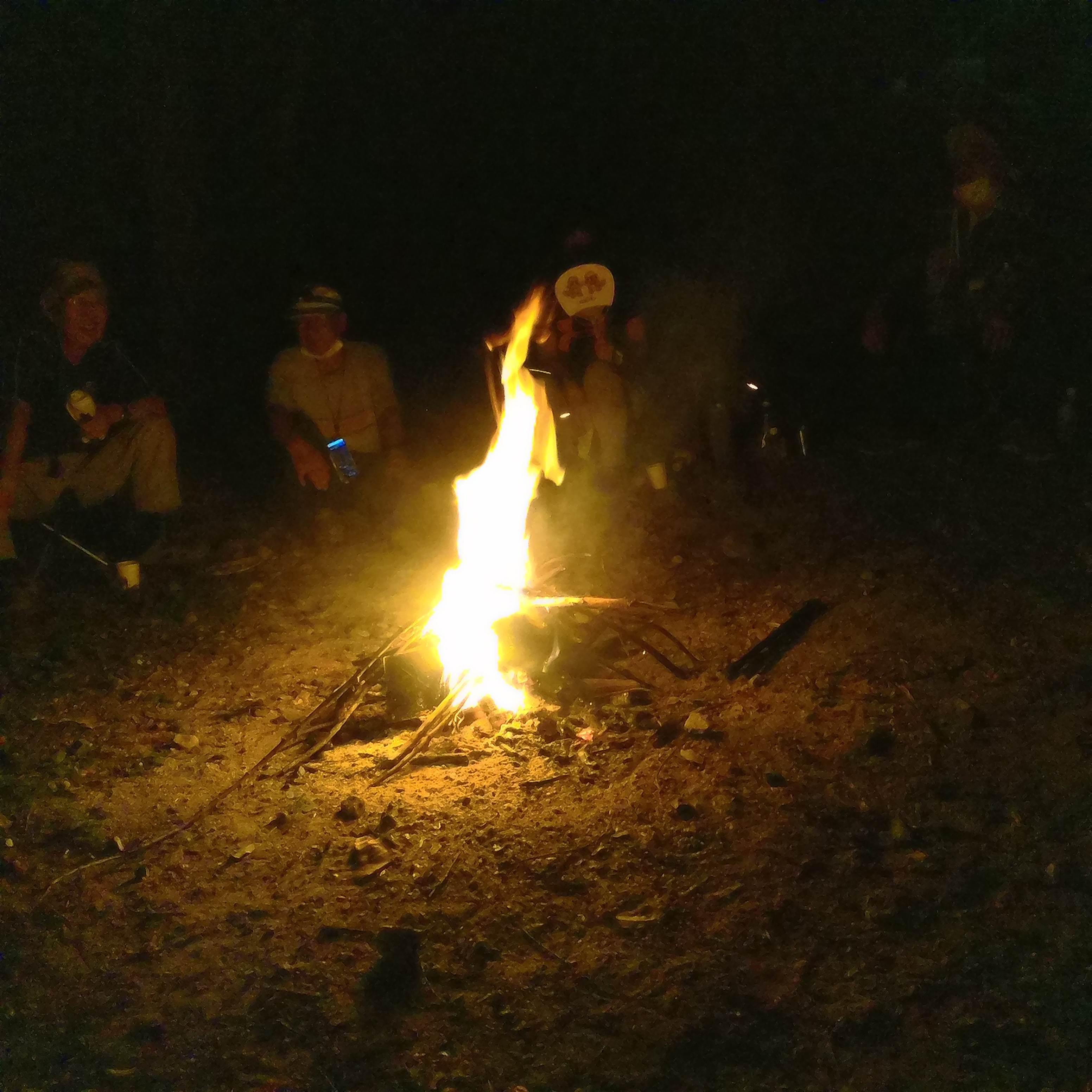 残念ながら満点の星空には程遠かったが、闇夜の中、若木さんのリードによる焚火を囲んでの2次会が始まった。テーマは「懺悔」。いろいろな懺悔があった。事新しい「懺悔」も飛び出し驚きもあった。山ではなかなか見ることのできない一面も見れて交流も深まった頃、焚火の火も弱くなりお開きとなった。