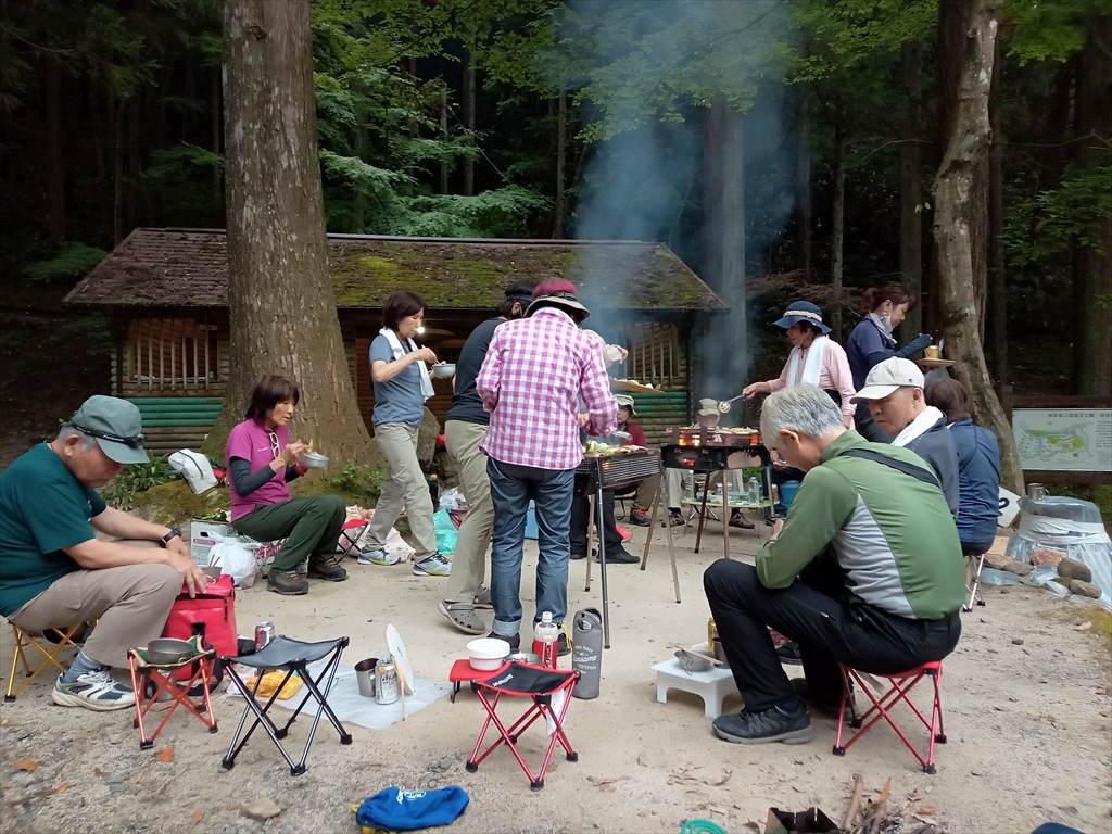 やまぼうしの共同テントは古いタイプなので、完成まで少し時間がかかったが参加者のほとんどの方はマイテントを持参されていて、1人でサッと組み立てられてビックリした。最近のテントは、コンパクト軽量で張るのも簡単らしい。夕食のバーベキューも野外でみんなとワイワイ言いながら食べると美味しく食が進んだ。