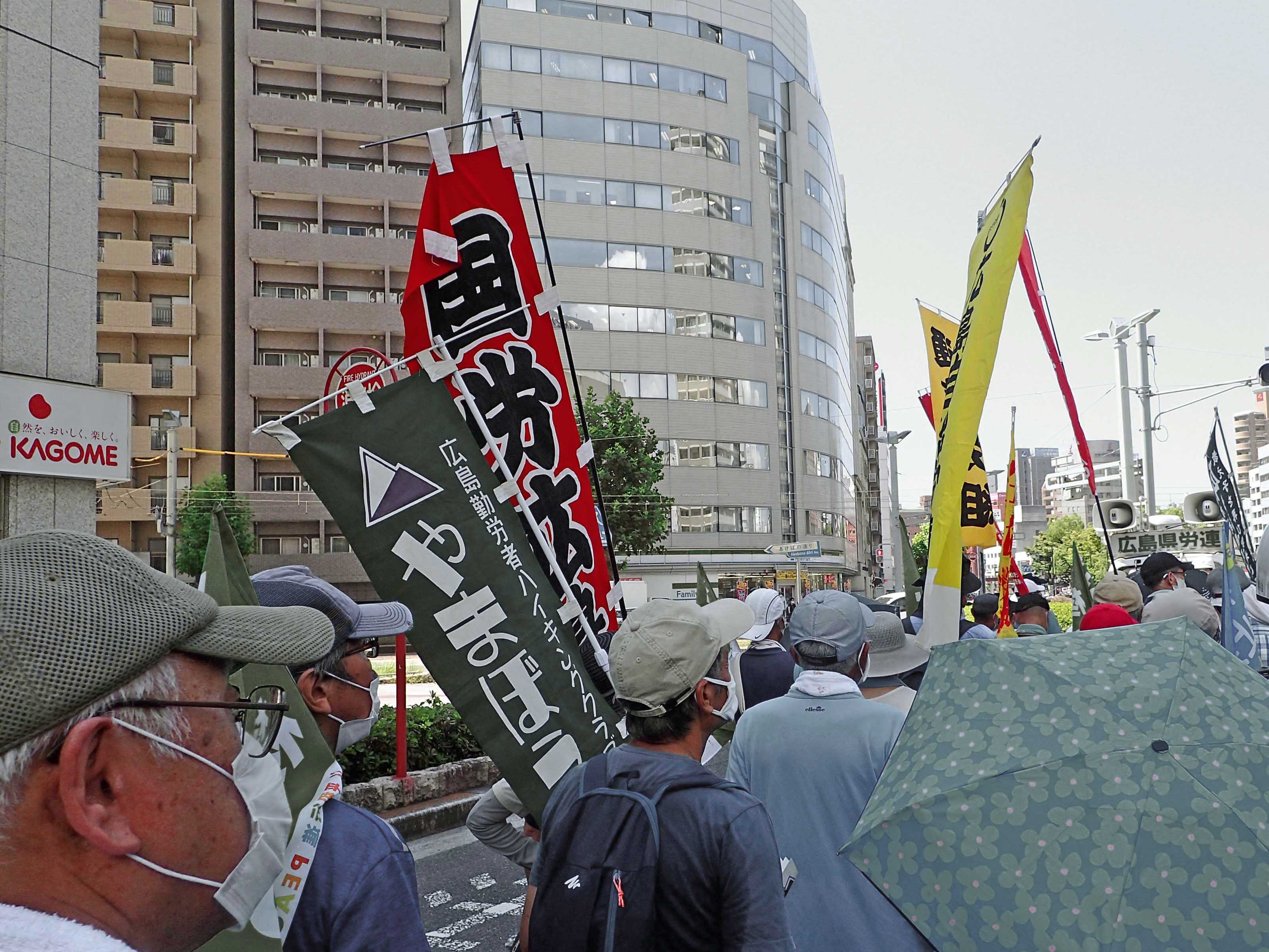 府中町原爆慰霊碑前8:45〜出発式8:55→東区役所9:40(休憩)〜9:55→広島駅前大橋10:15(休憩)〜10:25