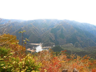 稜線は気持良い林なのでのんびり歩くが、ゆるやかなアップダウンが続き体が冷えてきた。しかし立岩山に近づくと急な登りになりまた暑くなった。大きな岩が現れ立岩山の山頂に立つ。ここからの展望は素晴らしい。目の前に十方山がデンと座り、手前下は太田川本流をせき止めた立岩ダムのつくる龍神湖が見える。足元はツツジの紅葉だが今年は赤色がさえない。集合写真を撮ってから昼の休憩とした。山頂が狭いので二手に分かれての昼食となった。