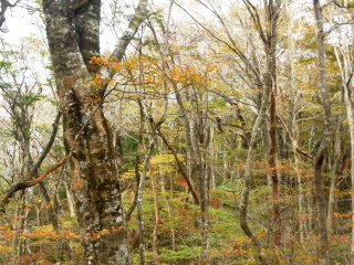 午後は来た道を帰る。広葉樹の自然林で、この時期紅葉を期待してきたのだが緑色が多い。よく見るとカエデが全て緑色で色づいてない。温暖化、異常気象のせいだろうか。今年は夏のように暑い日が続いて、一週間前から突然寒くなった。ブナとカエデの林なのでどんな色になるか想像しながら歩いた。とにかく快適で長い稜線歩き、紅葉してなくても新緑のようだという人もいた。市間山まで戻ると、発電用風車を誰もイメージできないという感じで、どこに風車を?という話になった。
