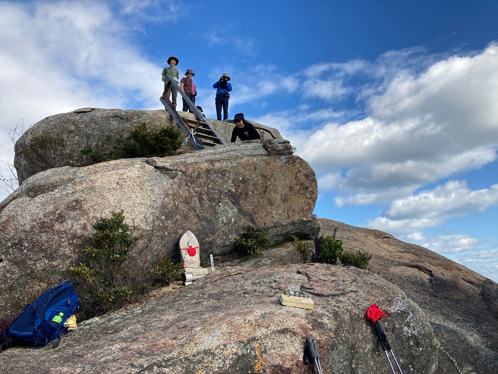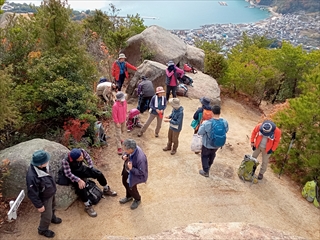 中筋を7:30に出発。途中渋滞もなく、桂浜温泉館前に予定よりも30分以上早く着いた。体験の方がいたので、自己紹介の後登山開始。比較的なだらかな道を登って行く。アベマキ等の枯れ葉で少し滑りやすい。木々の黄葉が日の光に映えて綺麗だ。早めの出発だったので、千畳敷に寄り眺望を楽しんだ。ここから山頂までは、急登。