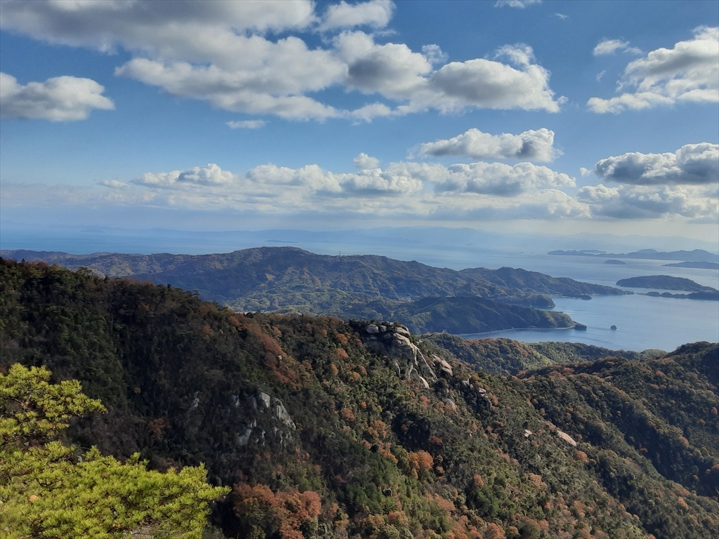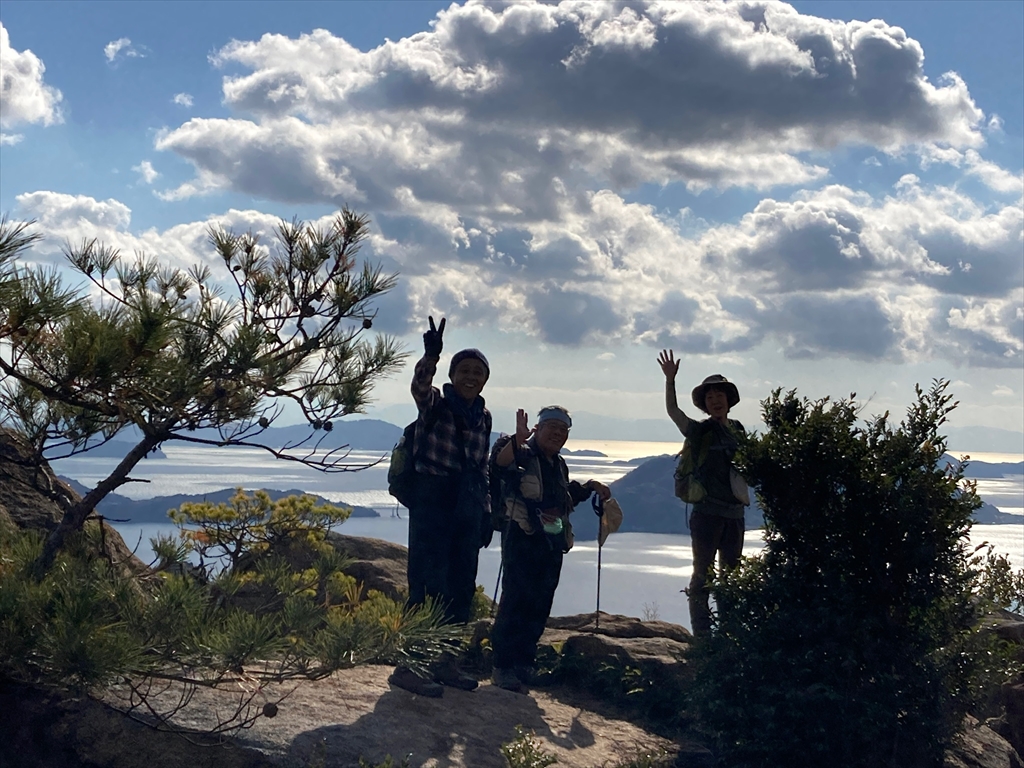 遠く四国の山までかすかに見えました。普段あまり写真を撮らない私ですが、スマホのシャッターを何回押したか覚えていません。勢い余って若い娘さん3人組の写真まで撮ってあげてました。