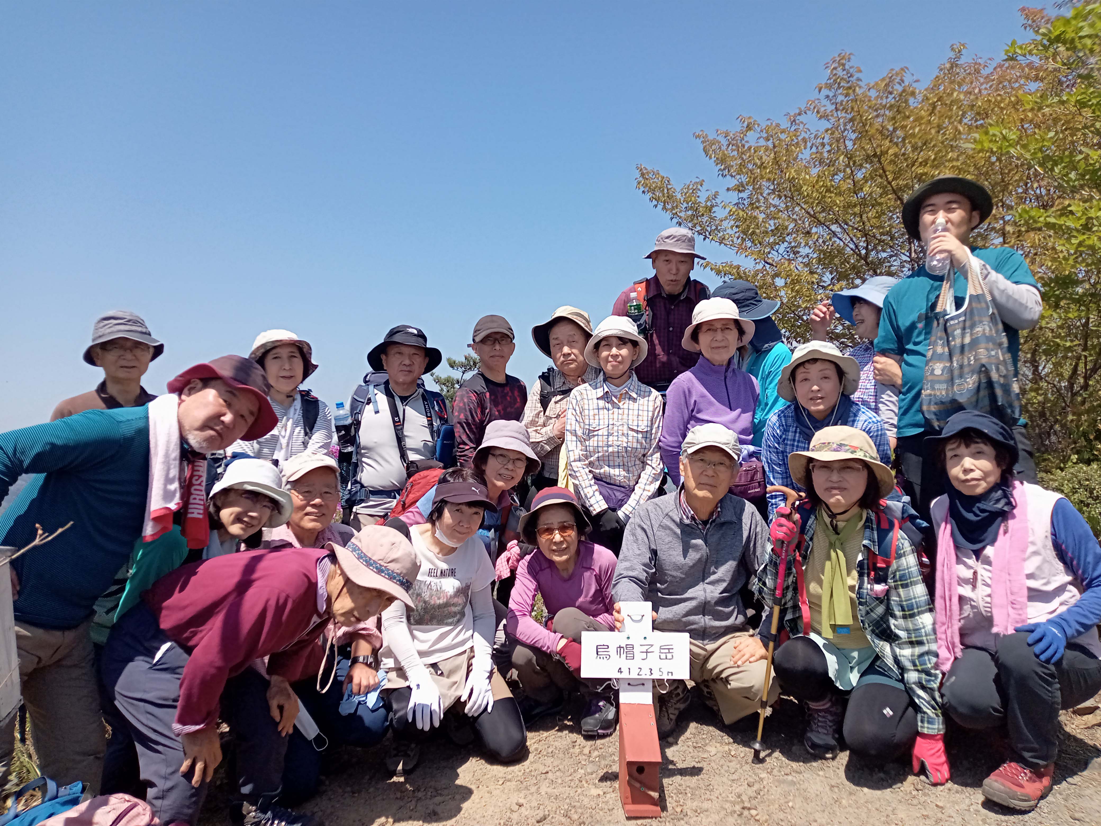 続く烏帽子岳へは新緑と木漏れ日の中を、山歩きを楽しみながら一部急登が現れたが難なくこれをかわして約20分で到達した。頂上からの眺望は国東半島や四国の佐田岬を望むことが出来たが、薄く霞がかかりそれより先は見られなかった。