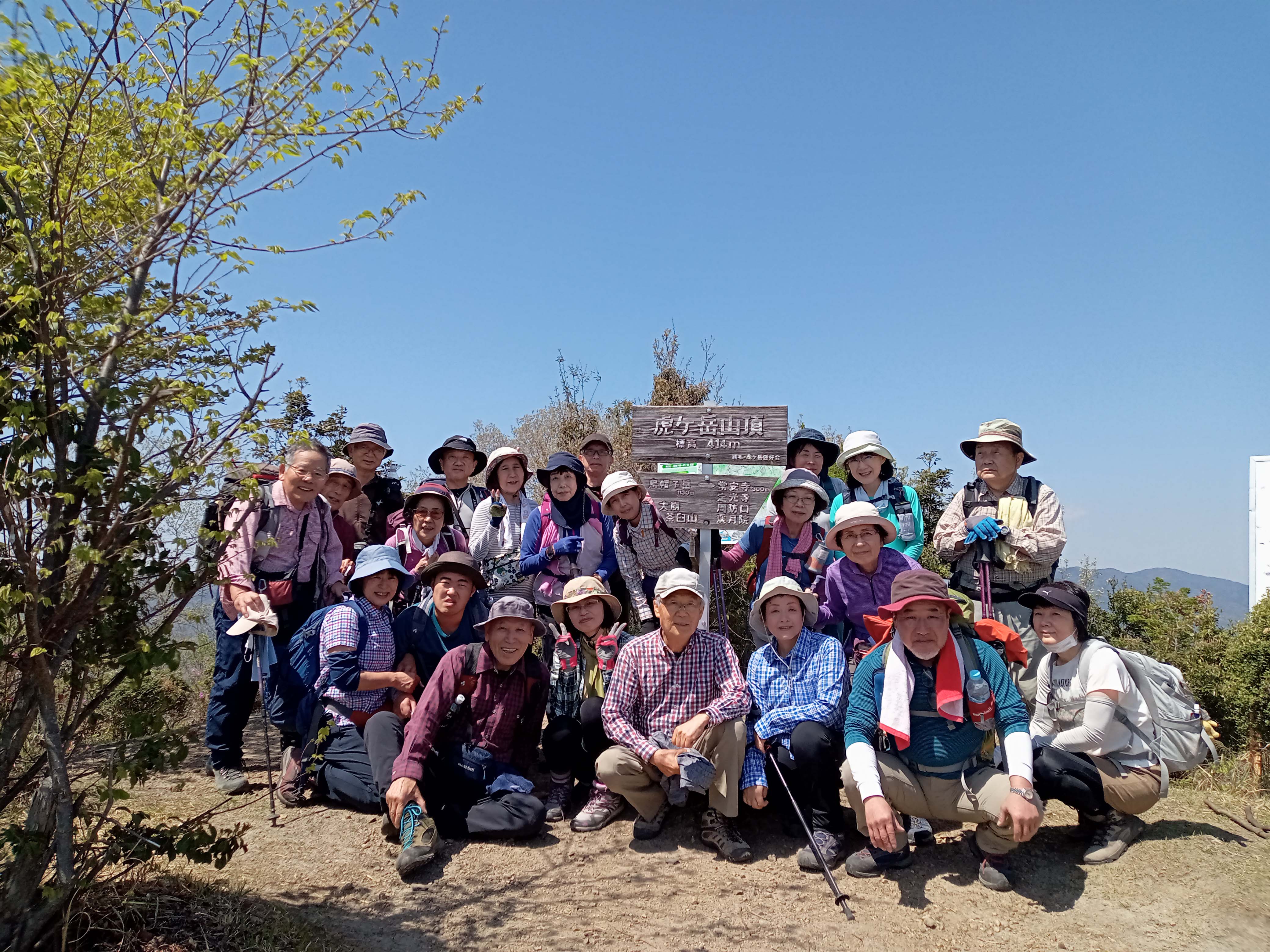 頂上には幾つもの椅子があり、春の日差しを受けながら昼食をとる者や、頂上の下の木立の中にあるテーブルとイスを利用して昼食をとる者とに分かれた。 丁度その時に、テーブルやイスを作った地元の人に居合わせ、記念撮影のシャッターをお願いした。