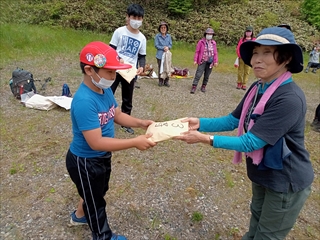 雲月峠で各班ごとに輪になり昼食。三浦さんの作って下さった冷甘酒に舌鼓を打った後はカラビナ投げのゲームをした。点数が入る度に歓声が上がったり順位順にもらったささやかな景品に喜んだりで童心に帰ったひと時であった。班分けにも配慮をした為か会員外の参加者の人達とも自然に打ち解けて交流が出来たように思う。