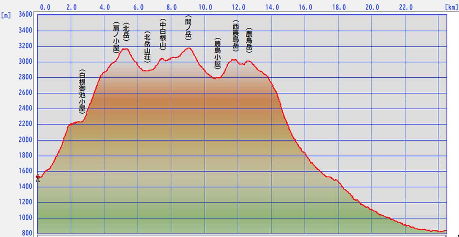北岳肩の小屋5:50→6:55北岳7:32→9:05北岳山荘9:20→10:10中白根山10:25→12:05間ノ岳12:20→14:00農鳥小屋(泊)
