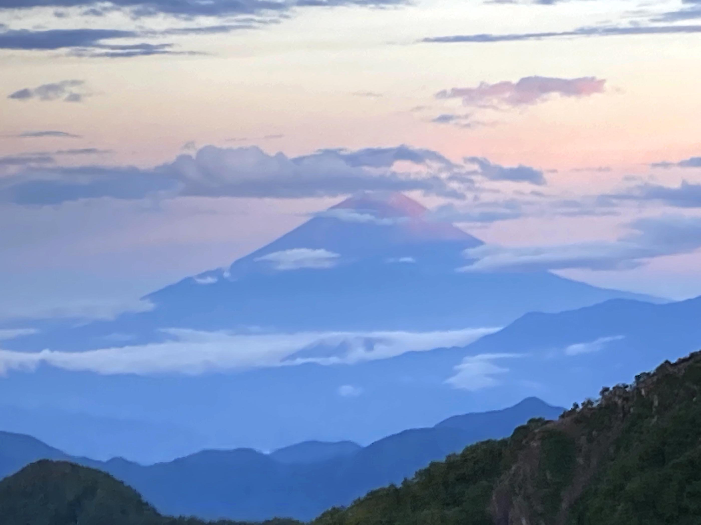 中でも、開運力があり縁起が良いとされる赤富士、農鳥小屋から少し雲がかかっていたものの山頂部分が赤く染まった赤富士を見ることが出来たのはラッキーだった。 しかも富士山を見上げるのではなく、目線の延長上に山頂が見える珍しい光景に、わぁー、すごい、キレイ・・・感嘆の声があがる。