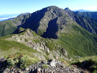小屋を出て歩き始めは、酸素が薄くしんどいが落伍だけはしてたまるかと、必死にリーダーを追う。今回4座目の西農鳥岳に6:45に何とか登頂した。登山道は難所が幾つもあり疲労困憊で、やっと今回5座目の農鳥岳には8:10に登頂した。