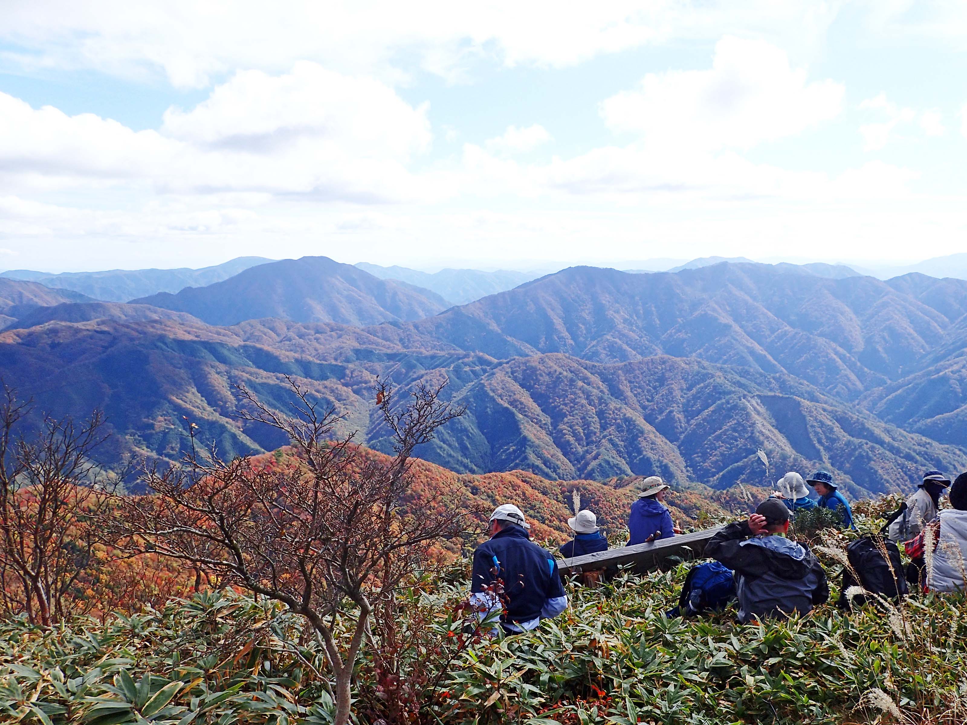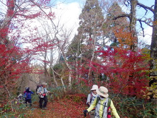 ゆるやかなアップダウンの道は自然林の中、杉(アシウスギ)は緑だがブナ・ナラなどの大木はほぼ葉を落し、明るく美しい。カエデの赤い葉がひときわきれいに見える。1191ピーク、北峰(1257m)、中峰(1250m)、を越えて安蔵寺山の頂きに着いた。この先の展望台まで行く。誰もが歓声を上げるような錦のパノラマであった。ここで大休憩のお昼を過ごす。