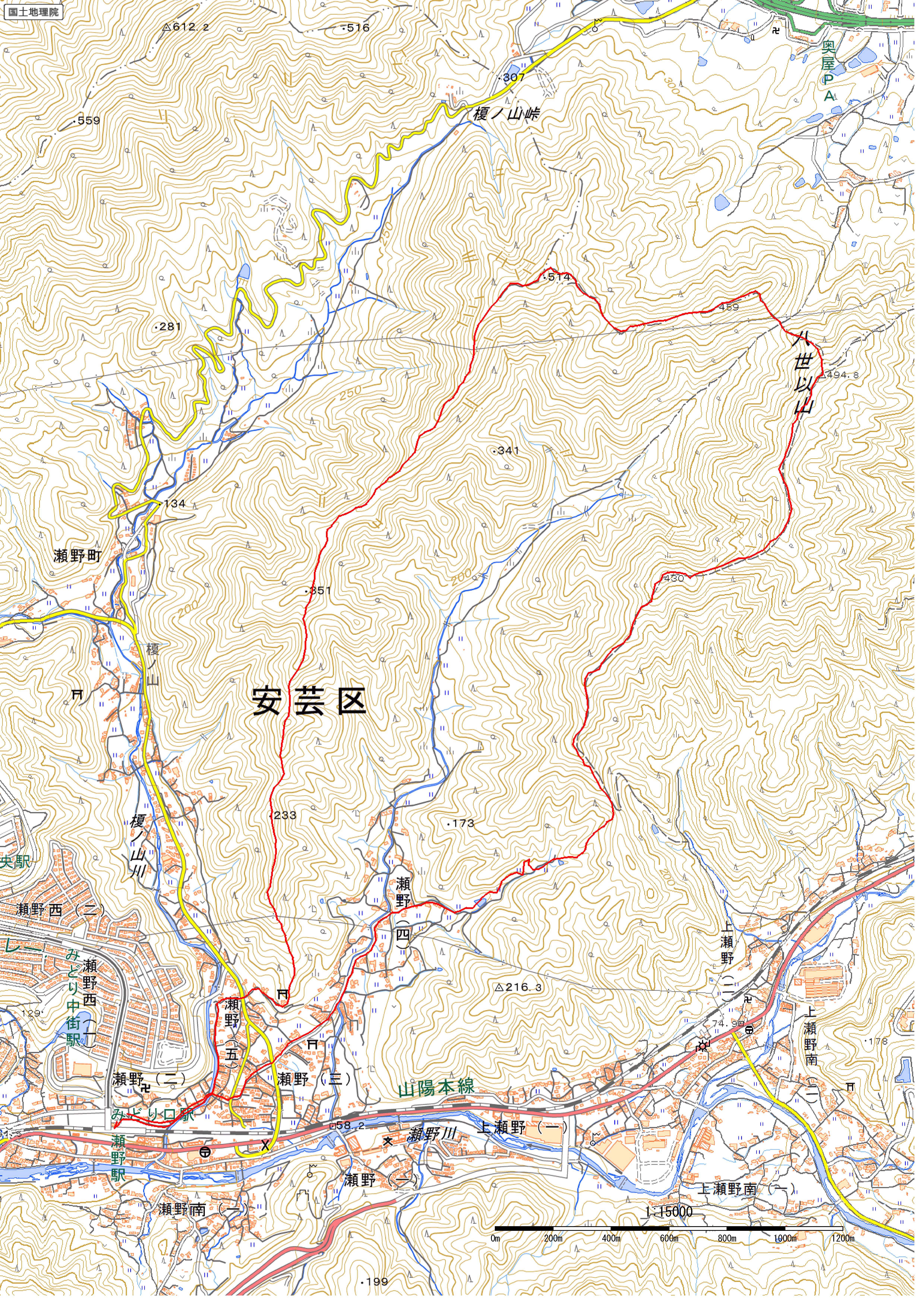 瀬野駅北口8:25→8:45中倉神社登山口9:00→10:30つつじ群生地→11:05東中倉山頂上(昼食)11:45→12:20伏附峠→12:50八世以山13:05→14:10立岩→14:15別れ道→14:35勝負迫登山口→15:15瀬野駅 (歩行時間 約5時間30分)