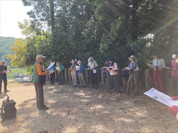 三々五々中倉神社まで歩き、そこで自己紹介、コース案内、ストレッチを軽く行いました。コースの案内では、最初の東中倉山までは急坂で厳しいと強調し、つぎの八世以山まではロープのところなど変化に富んでいる、その後はルンルン気分で行けると説明しました。
