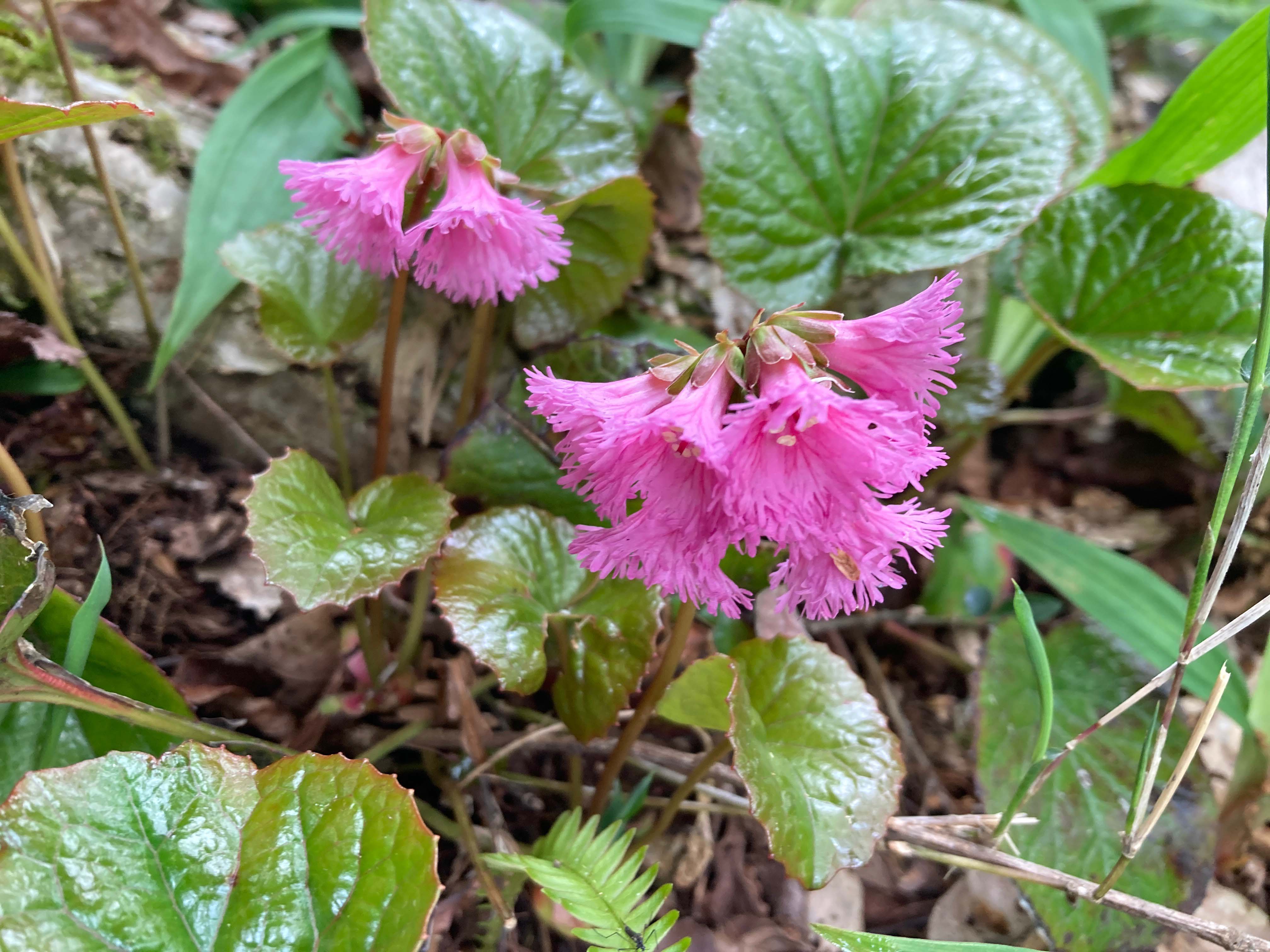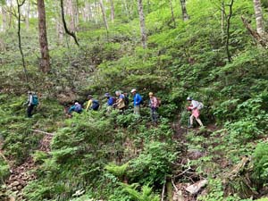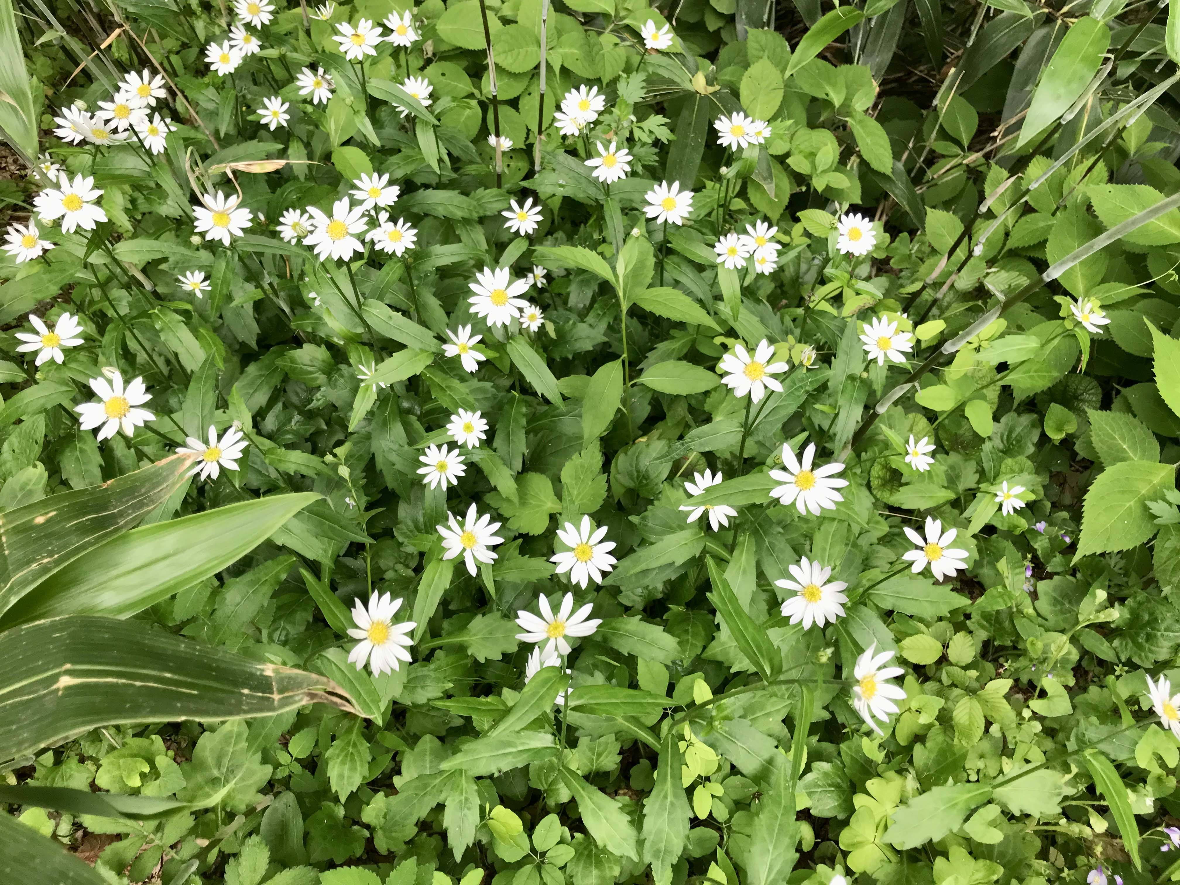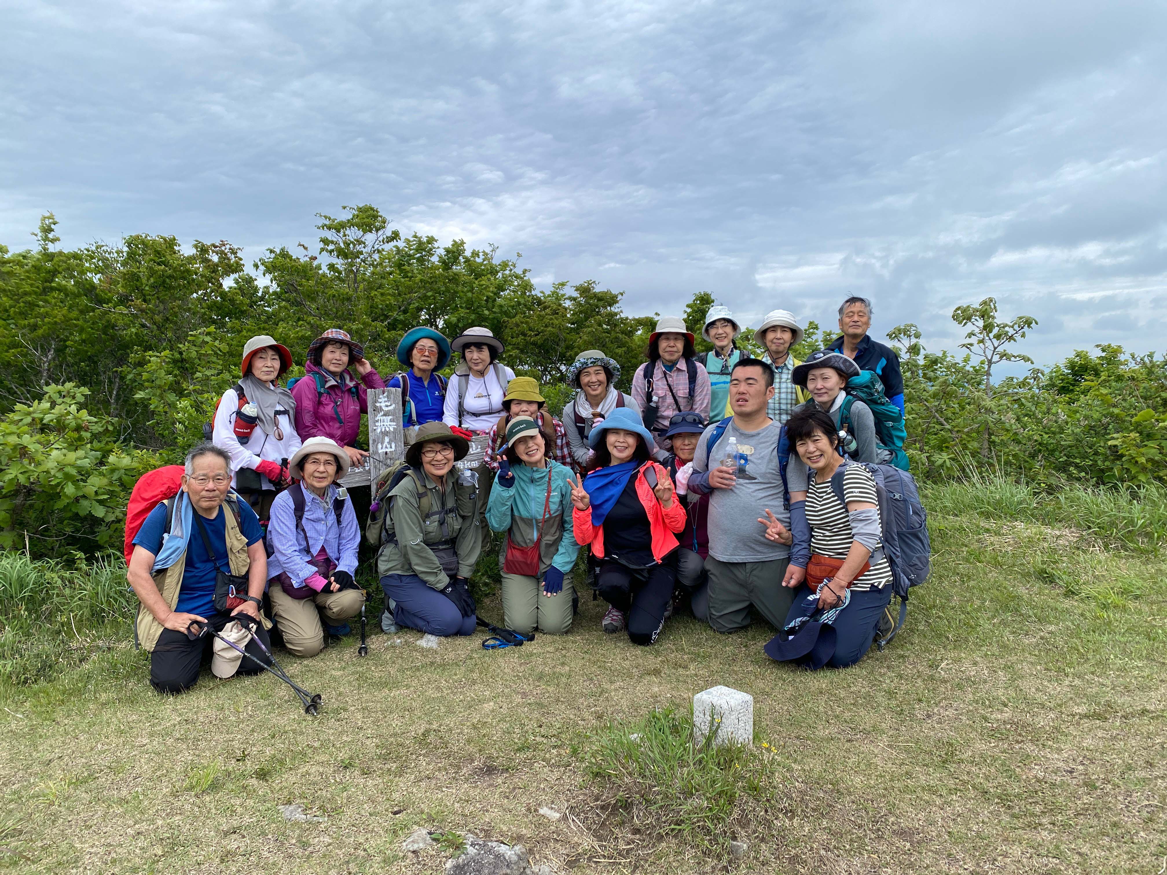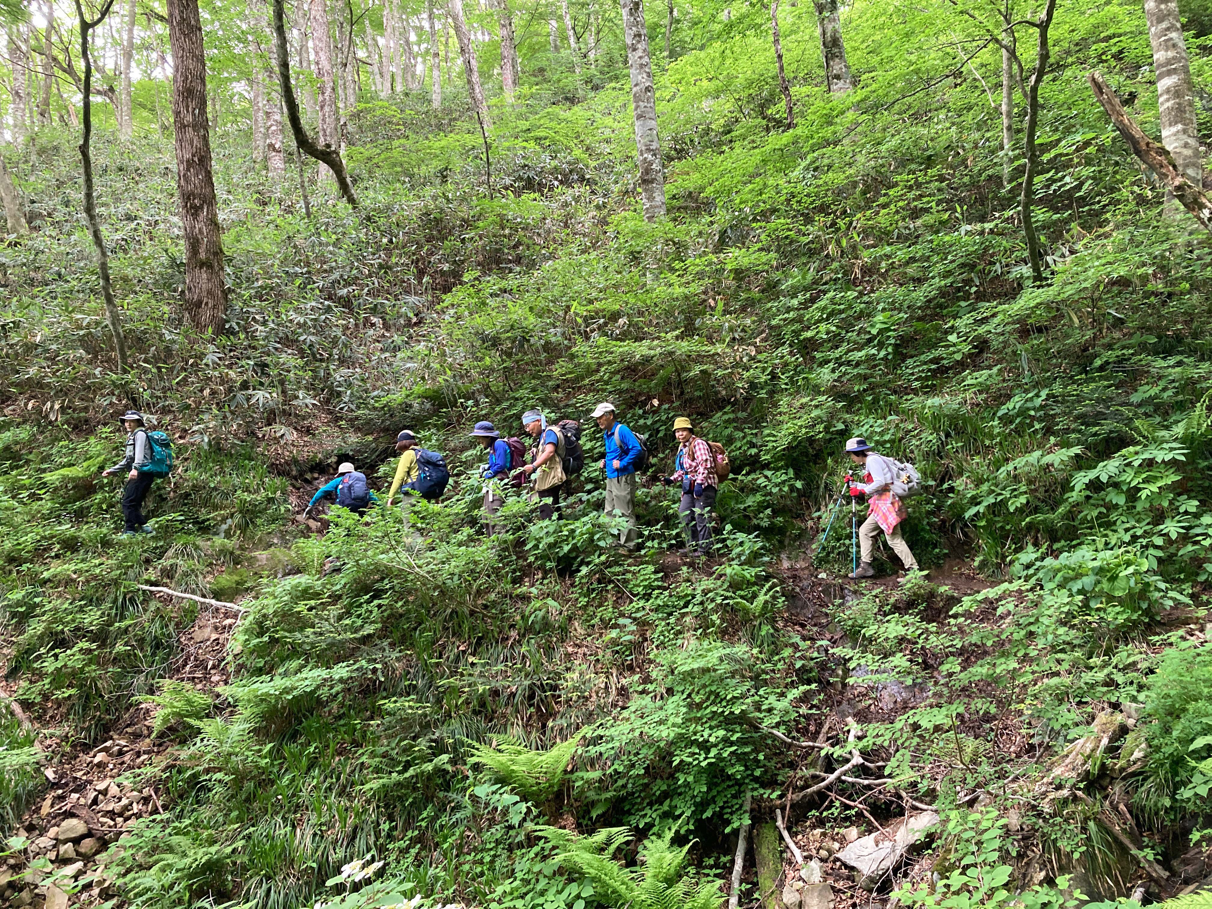 夕方から雨が降る予報でお天気は薄曇り、天候を心配しながら自宅を出る直前CLから体調不良のため参加出来なくなったと連絡が入り急遽CLを引き受ける事となり、SLは吉川さんにお願いする事になった。直前の変更に少し緊張しながら牛曳山登山口に着いた。登り始めると白いヨメナの花が満開、ヨメナロードが暫く続き素晴らしかった。他にもタニウツギ・イワカガミ・白いイワカガミ・エンレイソウ・チゴユリ・ナルコユリ・コケイラン・シャクヤク等も確認できた。今まで秋の紅葉の時期に登る事はあったがこの時期に登るのは初めてだ。同じ山でも季節が違うとまた印象が違い新たな発見が出来た。今回は私の失態が続き参加者の方にご迷惑をおかけすることになった。