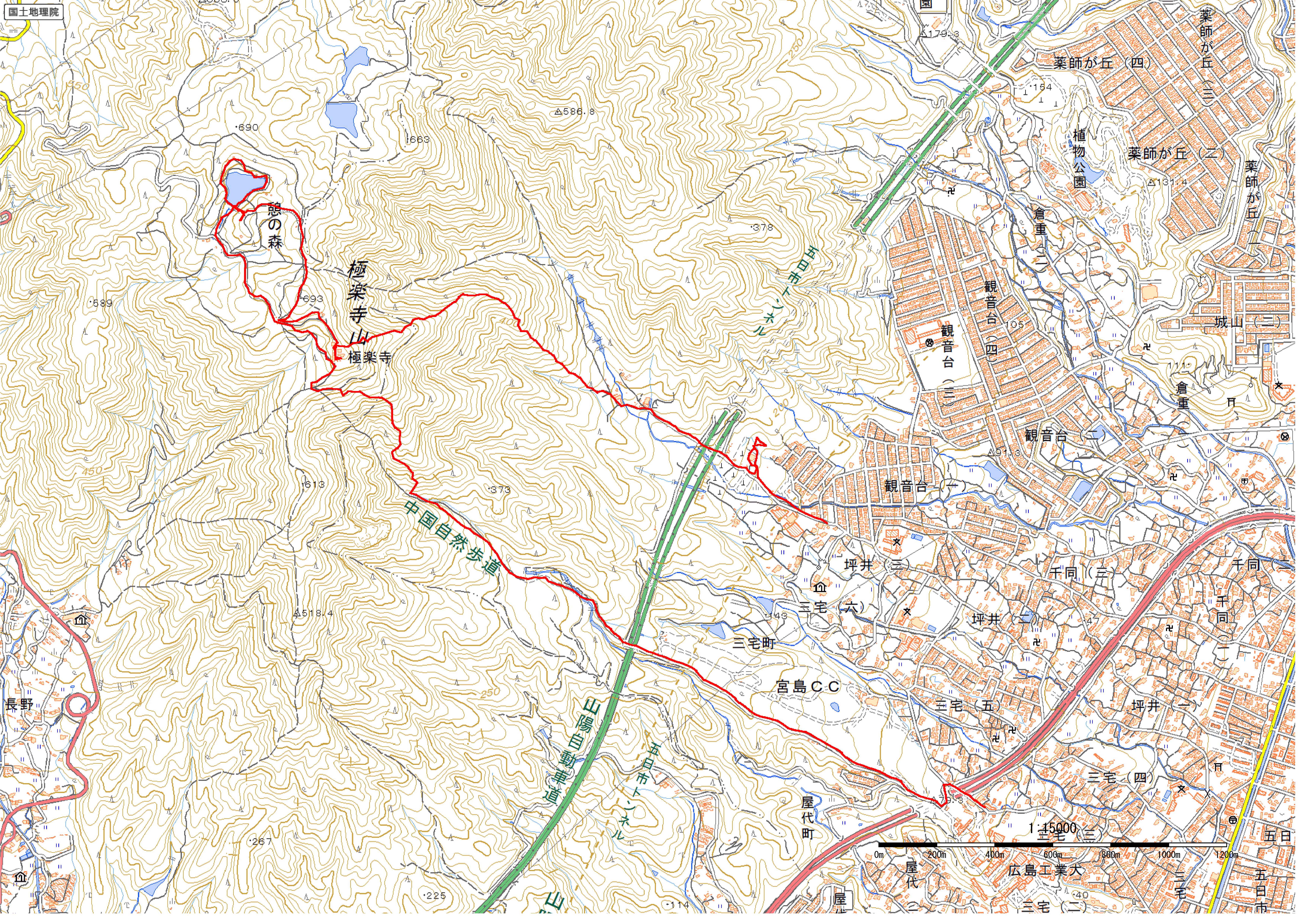 五日市駅南口9:05→観音台入り口9:25→観音寺散策9:30~10:00→観音コース登山口10:30→極楽寺山頂12:00→展望園地(昼食・蛇の池周辺散策)12:20~13:30→五日市三宅コース→広工大上バス停15:19