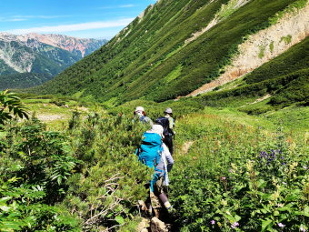 5:50三俣山荘を出発した。約1時間で黒部川源流の碑に至り休憩を取った。8:48岩苔乗越(いわごけのっこし)標高2731m。その先で不覚にも私が、伸びたダケカンバの下を歩行中足がふらつき転倒し左足の向う脛を打撲したが、カットテープで済んだ。続いて「水晶池」に向かうも、池は温暖化で干上がり残念であった。池のほとりで同行女性が準備した「アルファ米」を頂くがその美味しさに驚く。13:37高天原山荘に到着。 直ぐに水量豊かな水で石鹸を使わずにシャツ等も水洗いを行う。