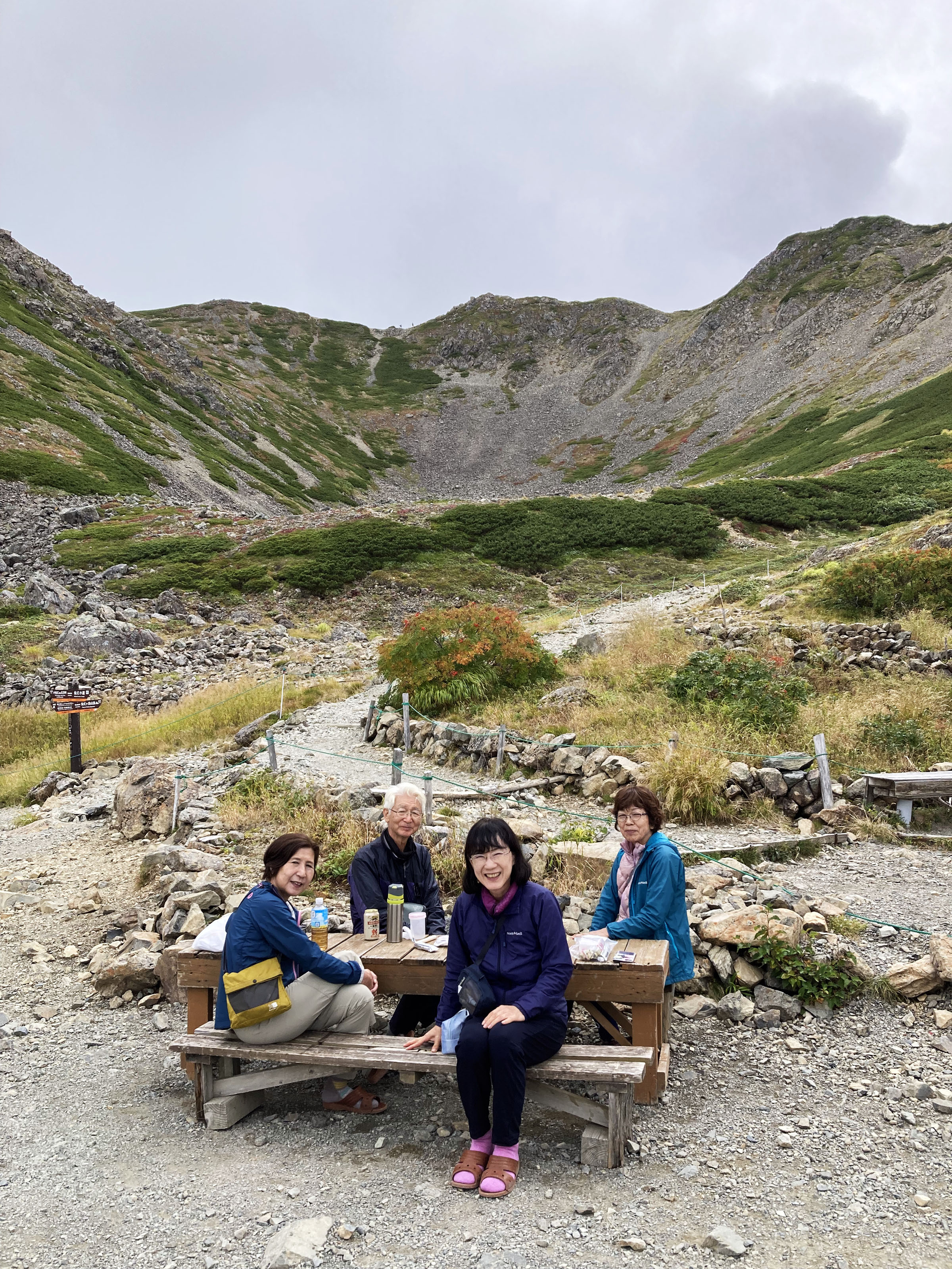 [4日目]ご来光を見ようと早朝の出発。朝食が遅いので前の晩におにぎりをもらった。霧の中、ヘッドランプで仙丈ヶ岳山頂に到着。日の出前、霧で暗い。ご来光を見る場所は少し小仙丈方面へ下ったところ。東の地平線近くが赤く染まる。雲の配置があまり良くないが、やはり高い山の上からのご来光はきれいだ。仙丈〜小仙丈の稜線からは間近に左から富士山、北岳、間ノ岳と標高が1位から3位まで並んで見ることが出来る。小仙丈山頂からは大きな小仙丈カールの優美な姿を現す。大展望であるが、帰りのバスに遅れないように下山開始。ここから北沢峠まで標高差800m余り、ひたすら下る。この日は3連休の初日、登ってくる人がとにかく多い。ケガをしないように慎重に下り無事バス停に到着。バスの終点仙流荘で入浴、蕎麦を食べて疲れを取る。タクシーで途中道の駅によって伊那市駅へ。JRは途中、中央東線の列車が大幅に遅れて予定の特急列車に間に合わないということで駅員さんの手を煩わせたが、無事予定通りに帰広できた。