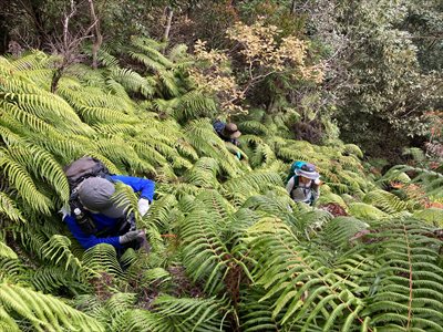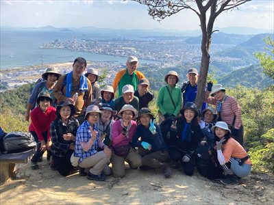 玖波駅から川沿いに行き大歳神社を過ぎてその先の石鎚神社広場で自己紹介をした後出発する。登山口からシダが道を塞いでいて登山道がはっきりしない所があったりと藪漕ぎも続いたが、木々の開けた所では展望も良く瀬戸内海の景色を楽しむことができた。更に進むと岩場もありで変化のある山だと思う。