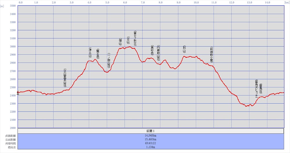 内蔵助山荘 5:00 〜 6:10 別山(南峰) 6:34 〜 6:37 別山(北峰) 6:56 〜7:02 別山(南峰) 7:17 〜 7:39 剱御前小舎 8:25 〜 新室堂乗越10:20 〜 雷鳥沢野営場 11:16 〜 らいちょう温泉雷鳥荘 11:47 〜 みくりが池温泉 12:17 〜 12:30 室堂登山口