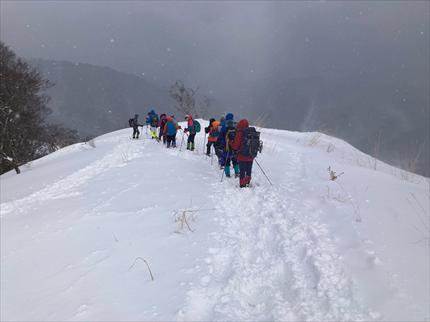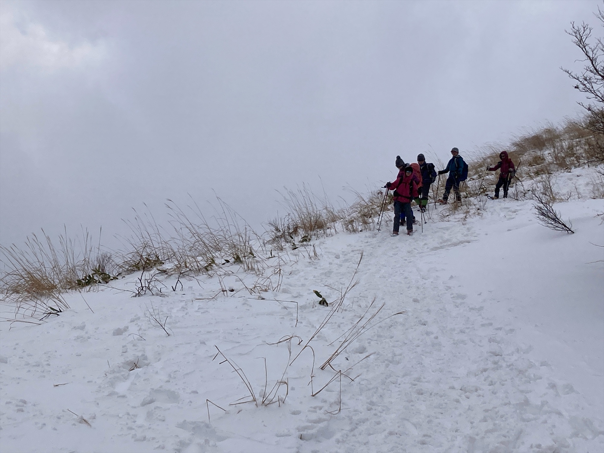 ワカン、スノーシュー、軽アイゼンを装着して出発
