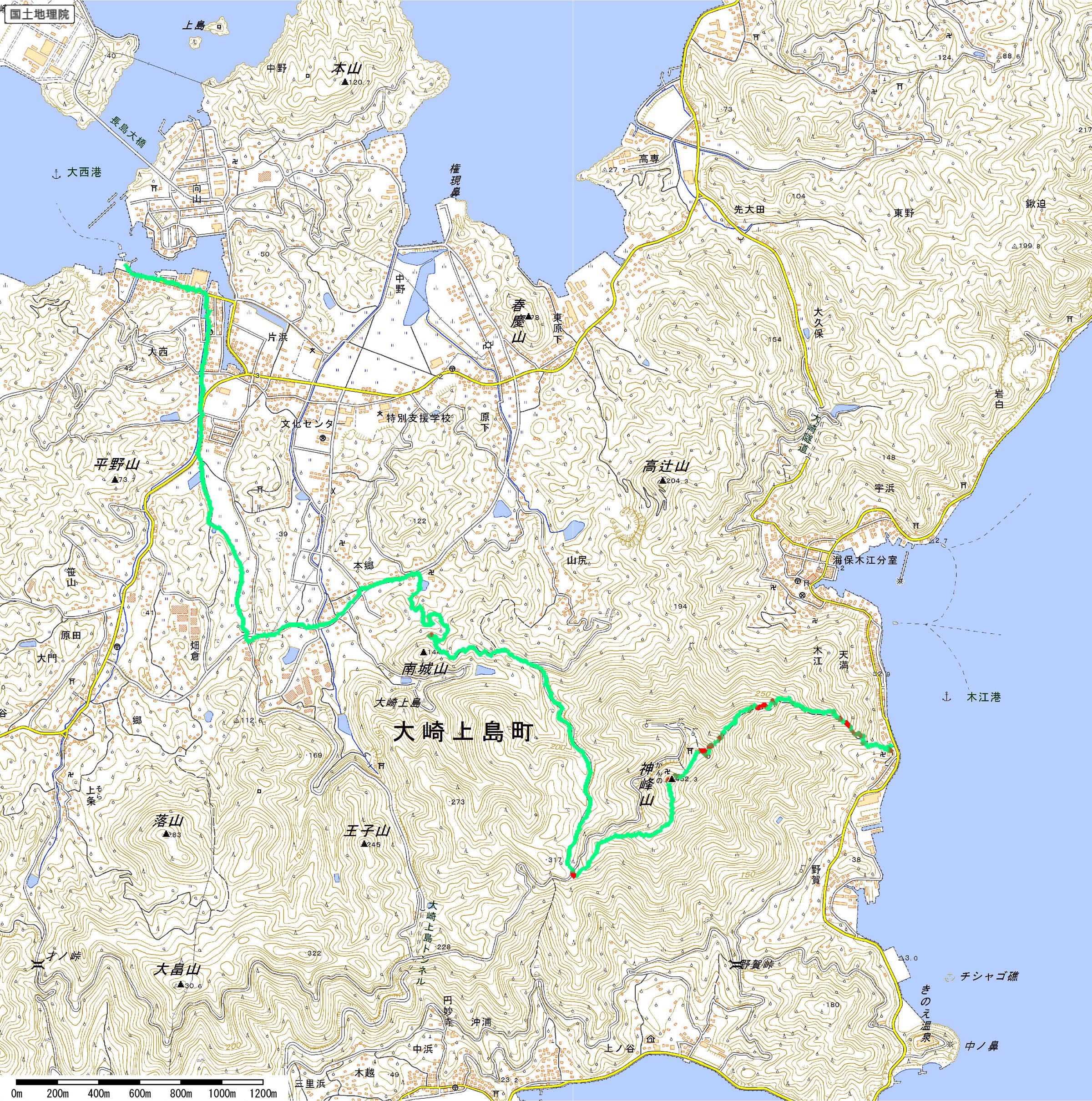 〜11:15神峰山頂11:20〜11:40丸太小屋12:15〜13:30大西港