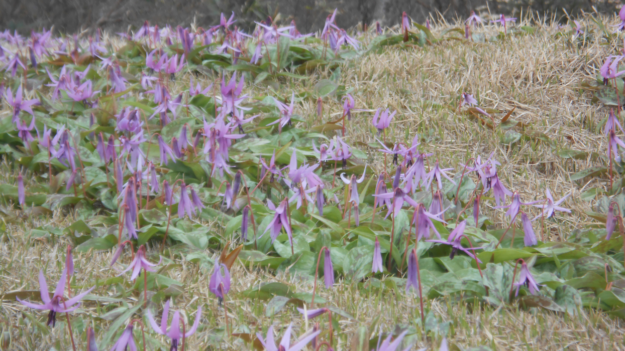 ここから少し西に進むと登山道脇にカタクリが花をつけているのを見ることができ、追っていくと頂上到着しました。