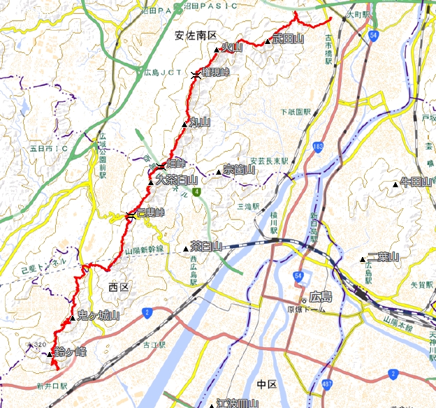 柚木城山15:10〜鈴が峰17:23〜井口中学校(解散)17:55〜JR井口駅18:11