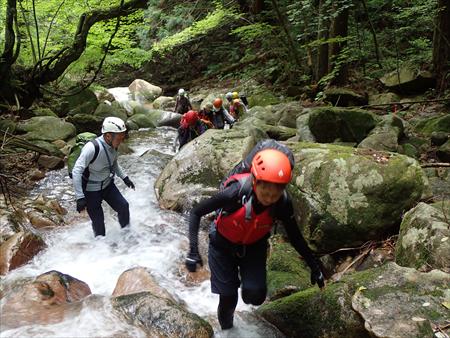 大滝ではロープで確保を行って参加者全員のシャワークライミングも実施しました。 2日前の雨でやや水量が多かったので、滝の本流を狙わずに、少し横の流れが弱いところをロープで安全確保して登って遊びました。 参加者全員無事に登れました。 3連滝の上部で渓流の涼感を楽しみながら昼食を摂った後、沢の終点目指してひたすら道なき道(というか川ですが)を各自の判断で深みに落ちないよう、滑ってコケないよう、 ベストなコースを慎重に選びながら歩きました。 3連滝から先の区間は水量がいい具合に増えていたので、深いところで腰くらいまで水に入りながら原生林探検のような不思議な景色の中を歩き、 全員ケガなく無事に沢の終点まで歩き通しました。