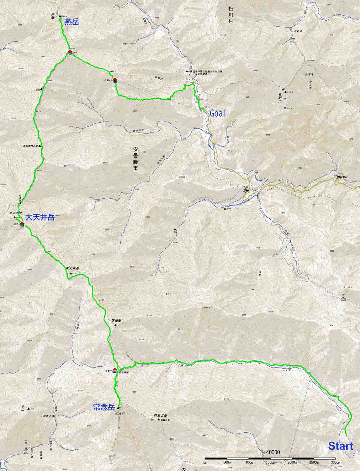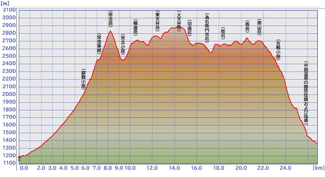 [A組]笠原沢11:00→11:40(昼休憩)12:00→12:25胸突八丁→14:40常念小屋