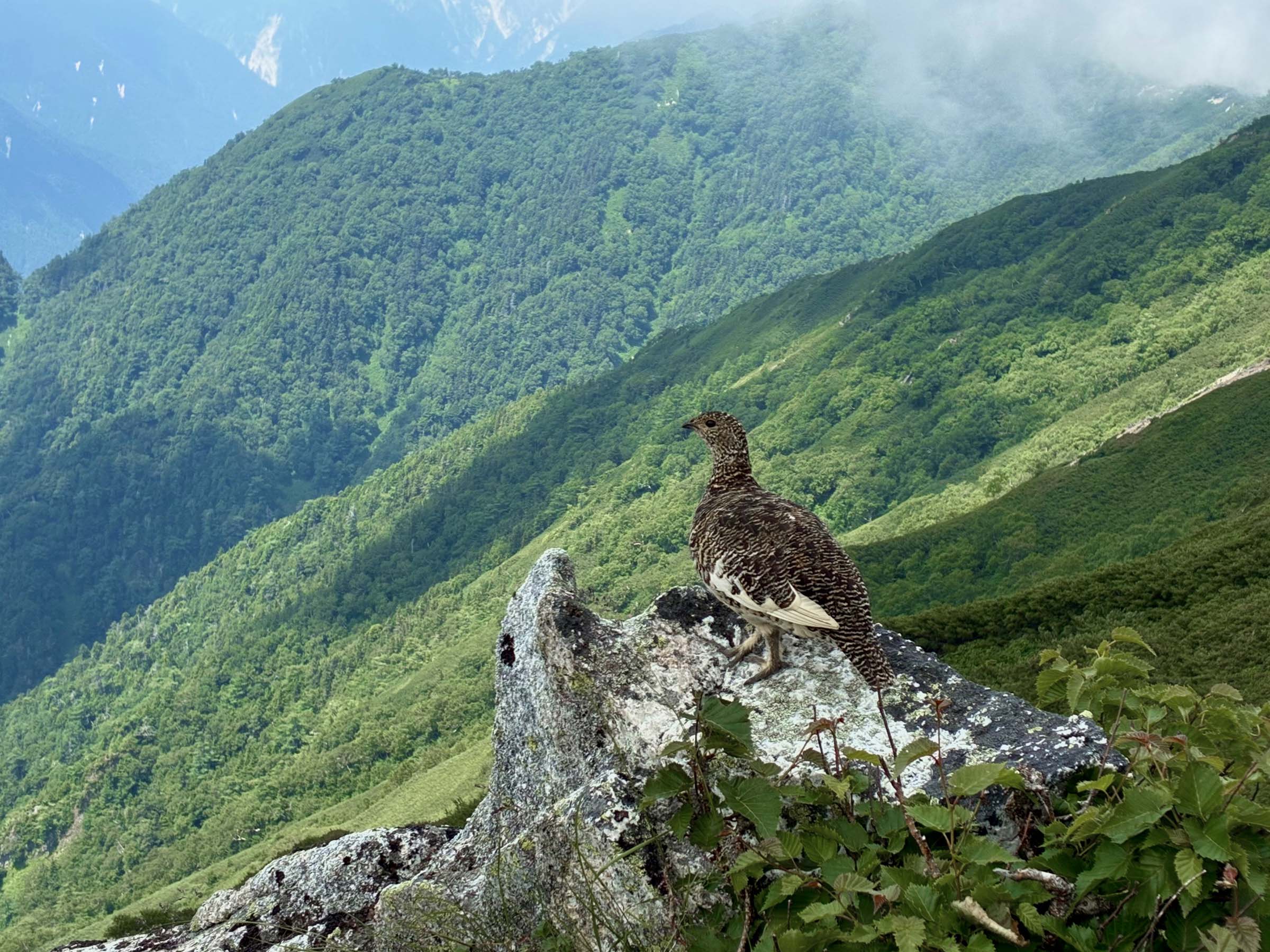 横通岳南肩を通過し槍ヶ岳を左手に見ながら稜線を進んでいく。時々こまくさを見つける。また東天井岳分岐辺りでは綺麗なお花畑を見ることができた。大天荘まで1qの標識を過ぎた辺りで雷鳥の親子を発見。父鳥とヒナ5羽、みんな出会いに感激して写真撮影。更にその後もう一度母鳥とヒナ数匹とも出会いとてもラッキーだった。