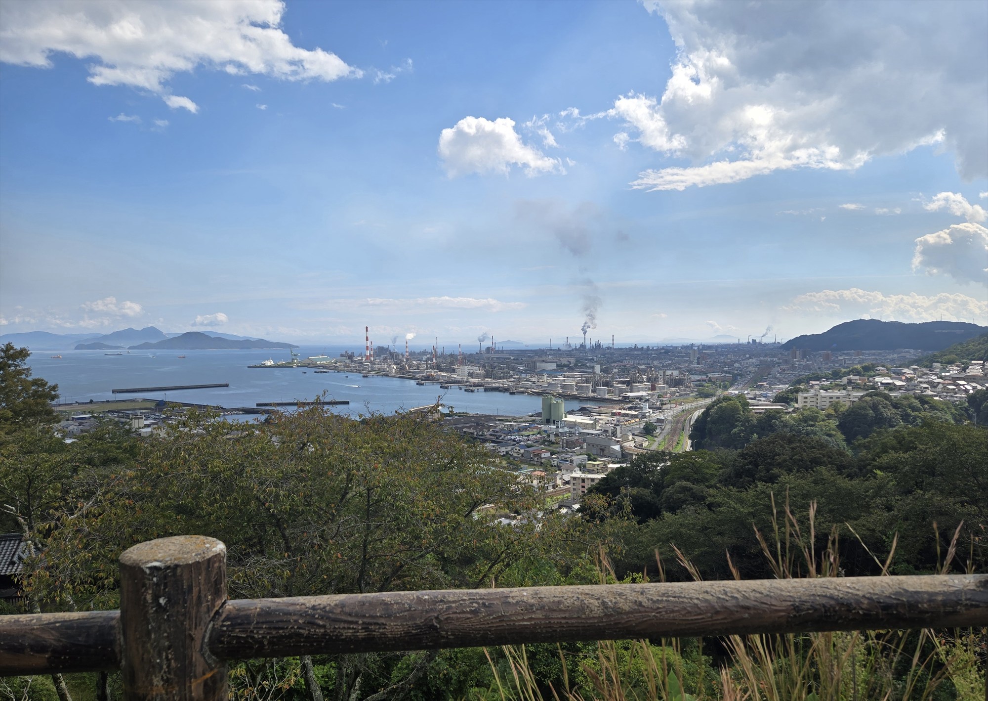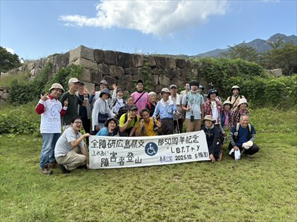 昼食後は本丸跡地の展望台に行きました。 視界がぱっと開けて瀬戸内海や工場群が綺麗に見える眺めに、みんなから歓声があがりました。 記念撮影をして、帰途につき、玖波駅で解散しました。 障害があると普段はどうしても出不精になってしまいがちですが、サポートを受けながら自然や登山を楽しめるように、というのがこの企画の趣旨です。 "やまぼうし"さんのご協力のおかげで20回以上続けられており、心よりお礼申し上げます。